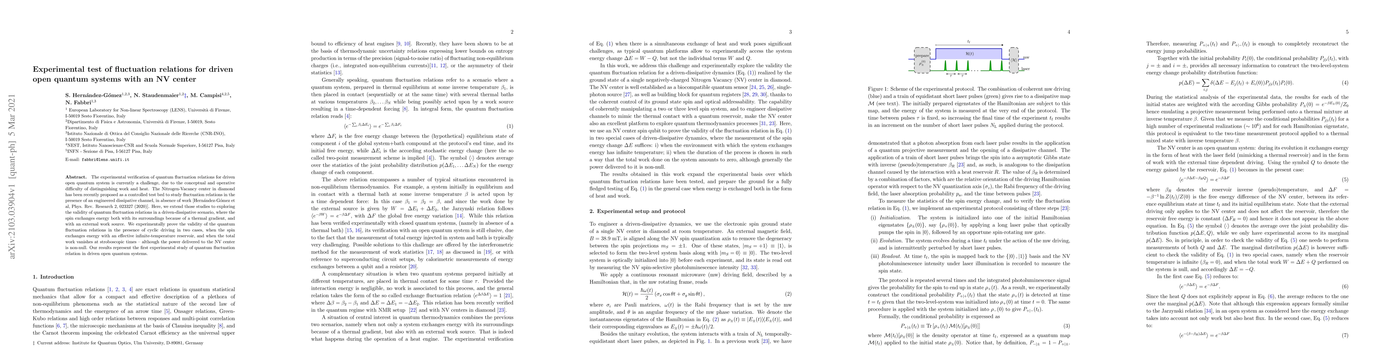 This paper experimentally verifies quantum fluctuation relations in driven open quantum systems using an NV center in diamond. It demonstrates the validity of these relations under cyclic driving, even when the NV center exchanges energy with an infinite-temperature reservoir or when total work is zero at stroboscopic times.