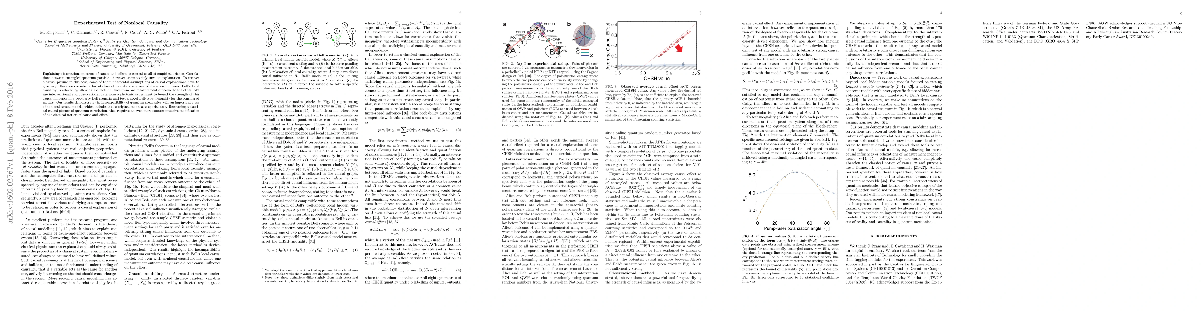 Explaining observations in terms of causes and effects is central to all of empirical science. Correlations between entangled quantum particles, however, seem to defy such an explanation. To recover a causal picture in this case, some of the fundamental assumptions of causal explanations have to give way. Here we consider a broad class of models where one of these assumptions, Bell's local causality, is relaxed by allowing a direct influence from one measurement outcome to the other. We use interventional and observational data from a photonic experiment to bound the strength of this causal influence in a two-party Bell scenario and test a novel Bell-type inequality for the considered models. Our results demonstrate the incompatibility of quantum mechanics with an important class of nonlocal causal models, which includes Bell's original model as a special case. Recovering a classical causal picture of quantum correlations thus requires an even more counter-intuitive modification of our classical notion of cause and effect.