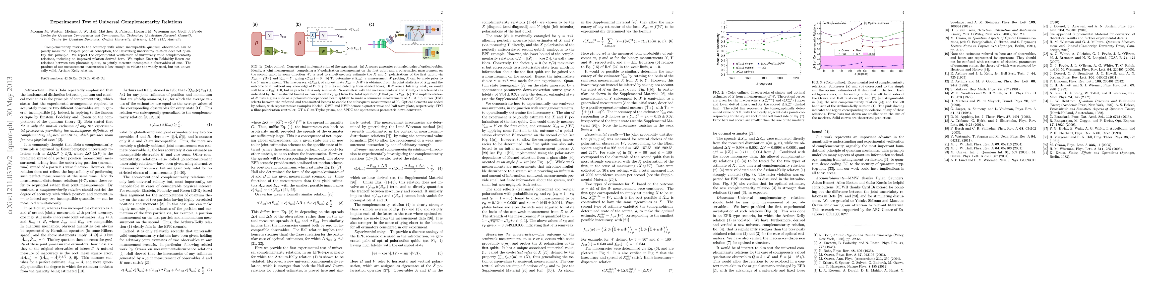 This paper experimentally verifies universally valid complementarity relations in quantum mechanics, demonstrating an improved relation by using Einstein-Poldolsky-Rosen correlations between photonic qubits to measure incompatible observables, thereby violating the Arthurs-Kelly relation.