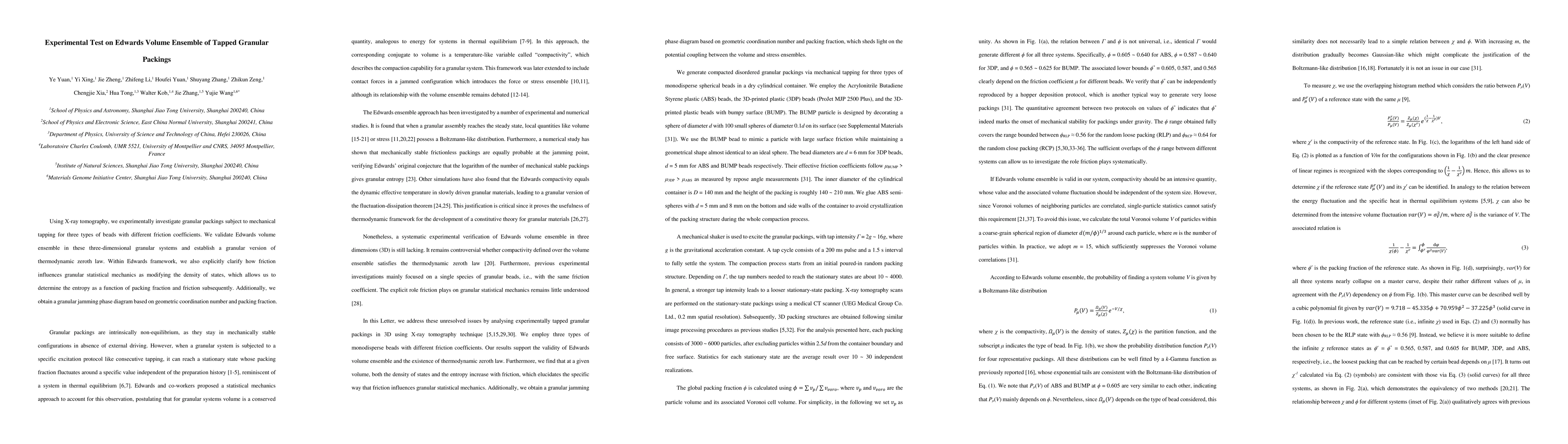 This study experimentally validates the Edwards volume ensemble for granular packings under tapping using X-ray tomography, revealing how friction affects the density of states and entropy in relation to packing fraction. It also establishes a granular jamming phase diagram based on coordination number and packing fraction.