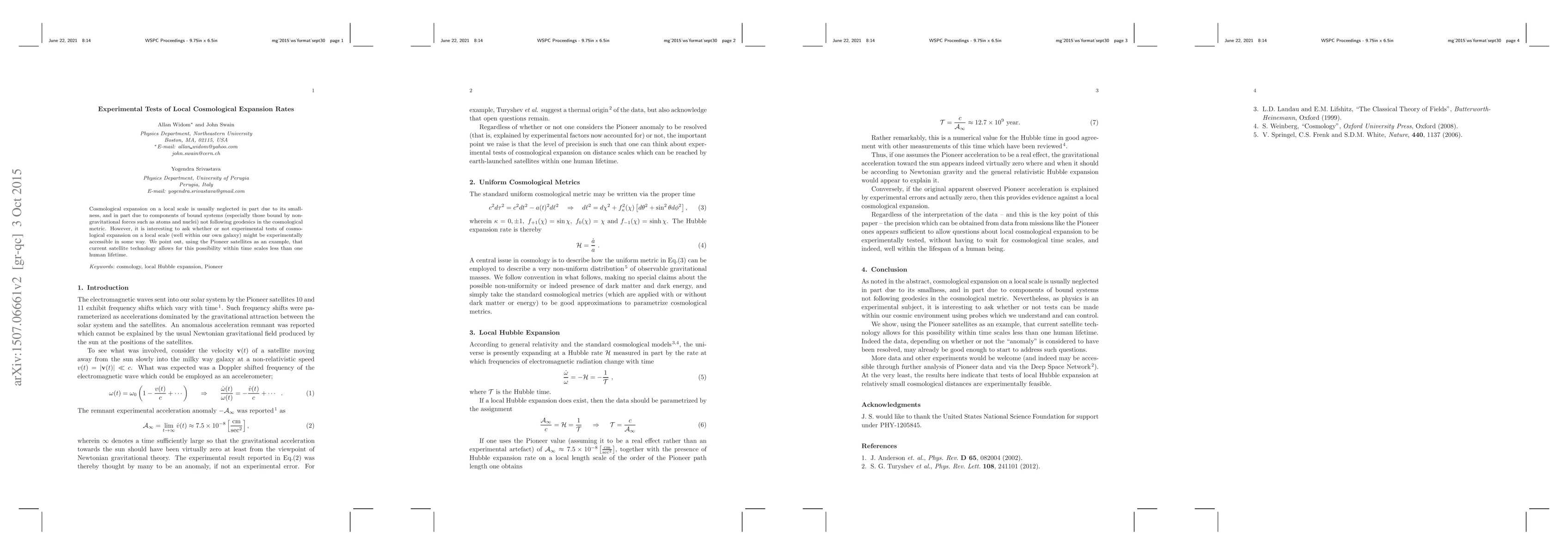 This paper explores the feasibility of experimentally testing local cosmological expansion rates, noting that current satellite technology, exemplified by the Pioneer satellites, may enable such tests within a human lifetime despite the smallness of local effects.
