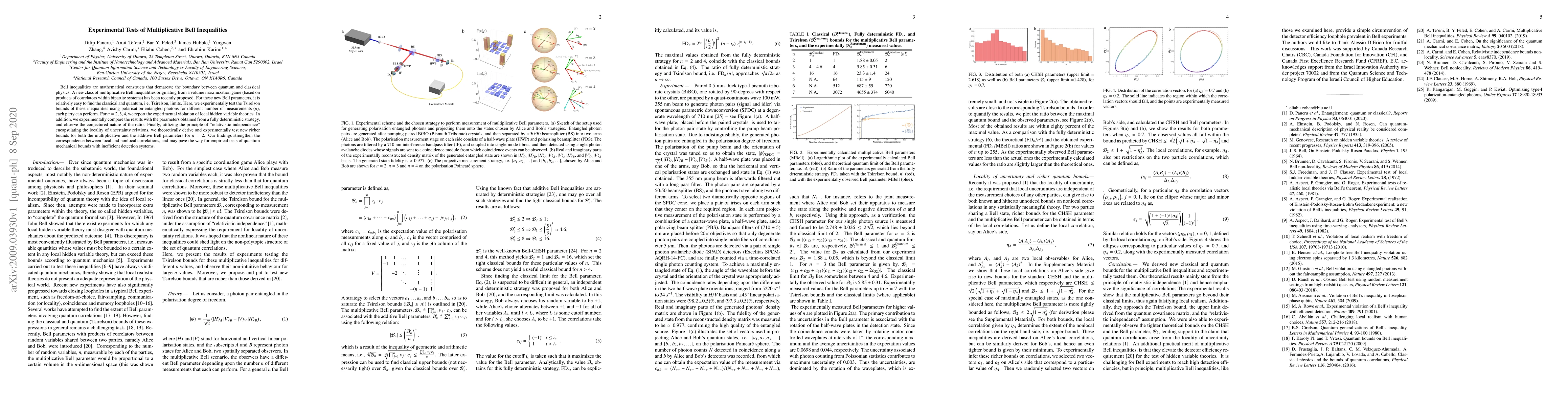 This paper experimentally tests new multiplicative Bell inequalities using polarization-entangled photons, demonstrating violations of local hidden variable theories for $n=2, 3, 4$. The results support the conjectured ratio between classical and quantum limits and introduce new bounds derived from relativistic independence.