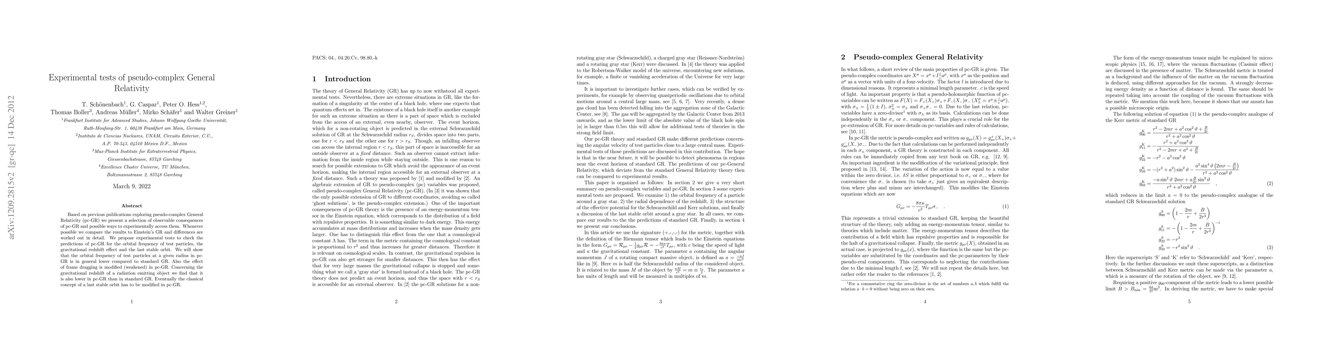 This paper explores observable consequences of pseudo-complex General Relativity (pc-GR) and proposes experimental tests to compare its predictions with Einstein's General Relativity. It finds that pc-GR predicts lower orbital frequencies, weaker frame dragging, and a modified gravitational redshift compared to standard GR.