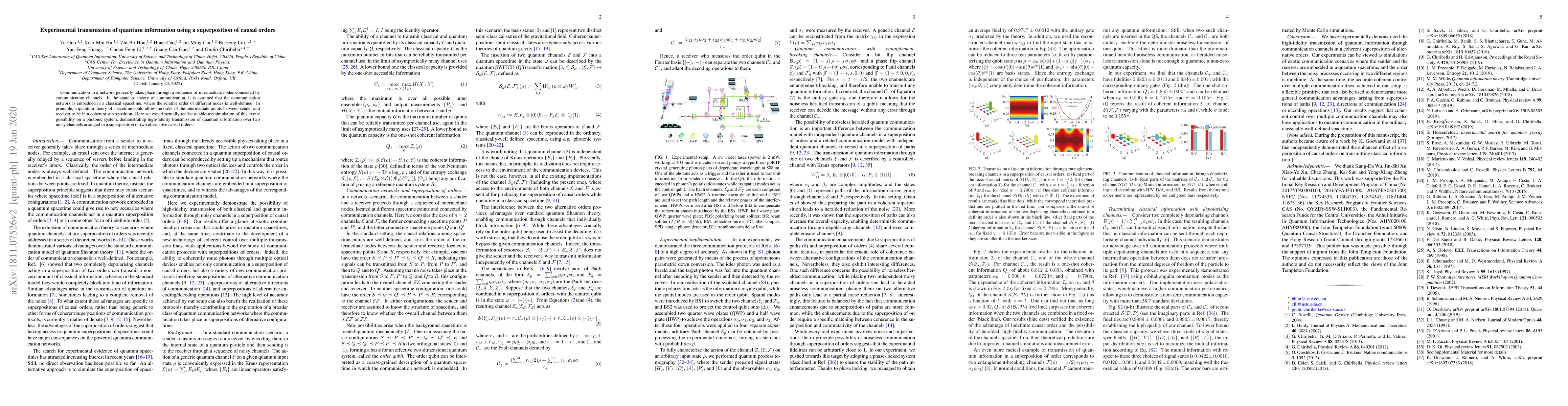 This paper experimentally demonstrates high-fidelity transmission of quantum information using a photonic system that simulates a network where the order of intermediate nodes is in a coherent superposition, challenging traditional causal order assumptions in communication networks. The results show successful quantum information transfer over two noisy channels arranged in a superposition of two alternative causal orders.