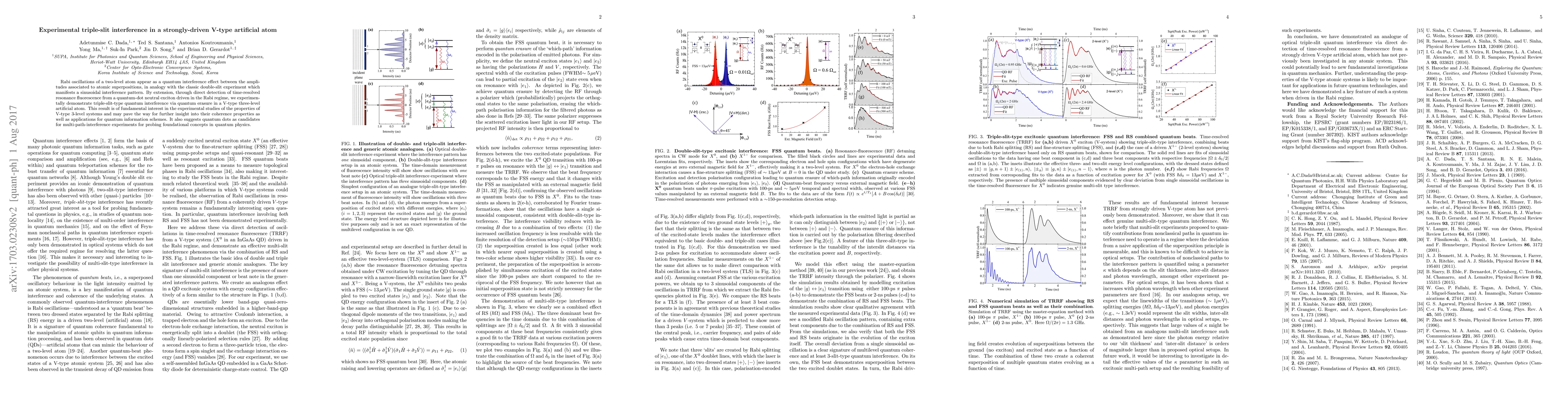 This paper demonstrates triple-slit quantum interference in a V-type three-level artificial atom using quantum-dot excitons driven in the Rabi regime. The findings provide fundamental insights into the coherence properties of V-type systems and suggest quantum dots for foundational quantum physics experiments.