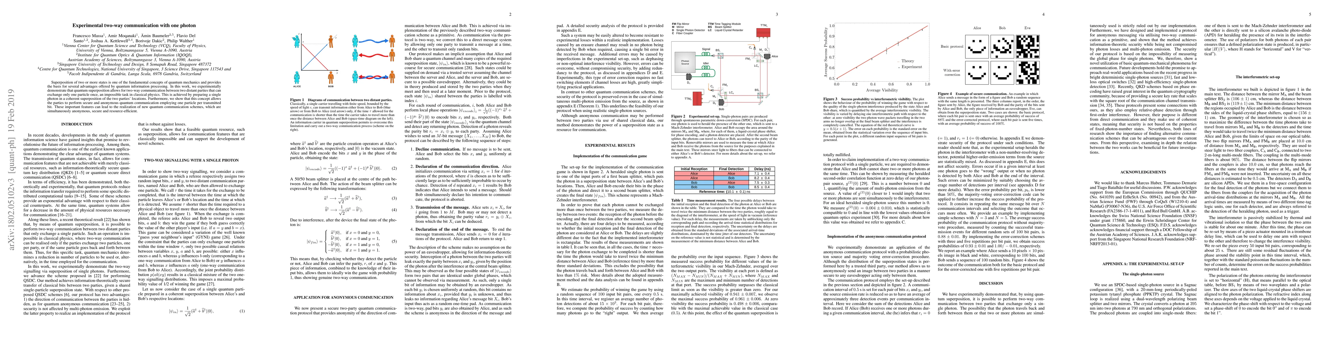 Superposition of two or more states is one of the fundamental concepts of quantum mechanics and provides the basis for several advantages quantum information processing offers. In this work, we experimentally demonstrate that quantum superposition permits two-way communication between two distant parties that can exchange only one particle once, an impossible task in classical physics. This is achieved by preparing a single photon in a coherent superposition of the two parties' locations. Furthermore, we show that this concept allows the parties to perform secure quantum communication, where the transmitted bits and even the direction of communication remain private. These important features can lead to the development of new quantum communication schemes, which are simultaneously secure and resource-efficient.