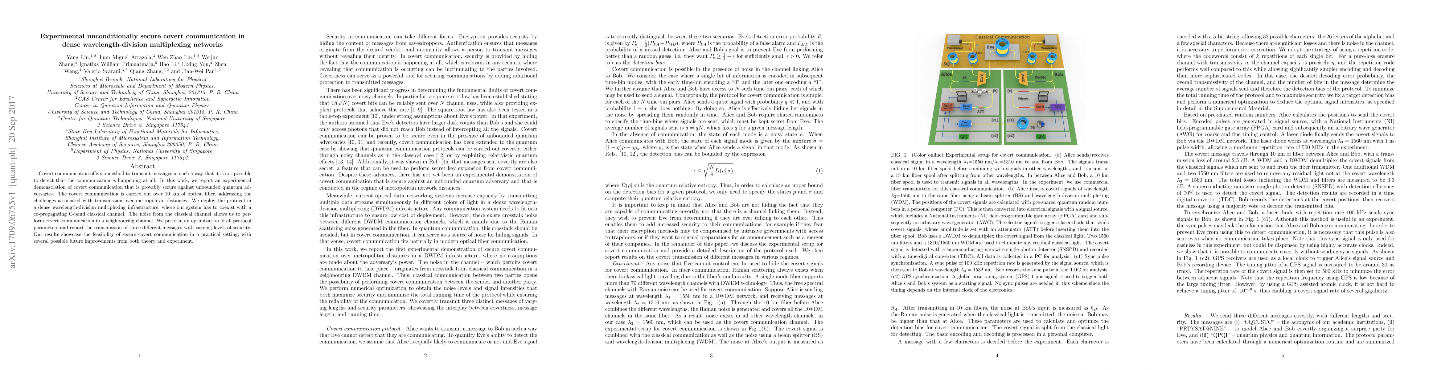 This paper demonstrates an experimental setup for covert communication that remains secure against quantum adversaries, utilizing dense wavelength-division multiplexing over 10 km of optical fiber. The system successfully transmits three messages amidst noise from a co-propagating classical channel, showcasing practical feasibility and potential for future enhancements.