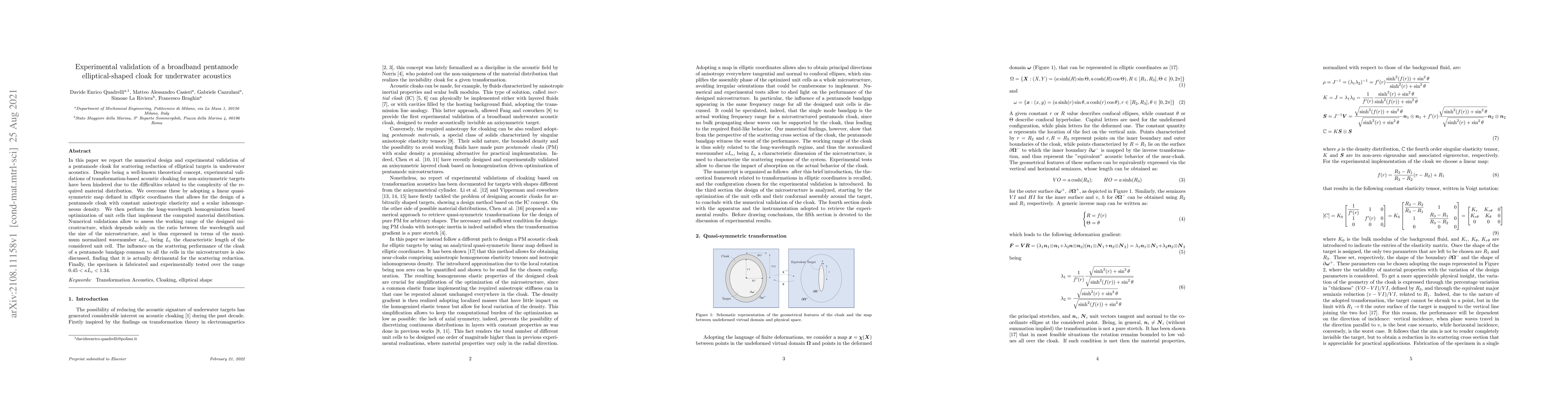 This paper presents the numerical design and experimental validation of an elliptical-shaped pentamode cloak for reducing acoustic scattering in underwater environments. The cloak, characterized by constant anisotropic elasticity and scalar inhomogeneous density, is designed using a linear quasi-symmetric map in elliptic coordinates, and tested over the normalized wavenumber range 0.45 < κL_c < 1.34.