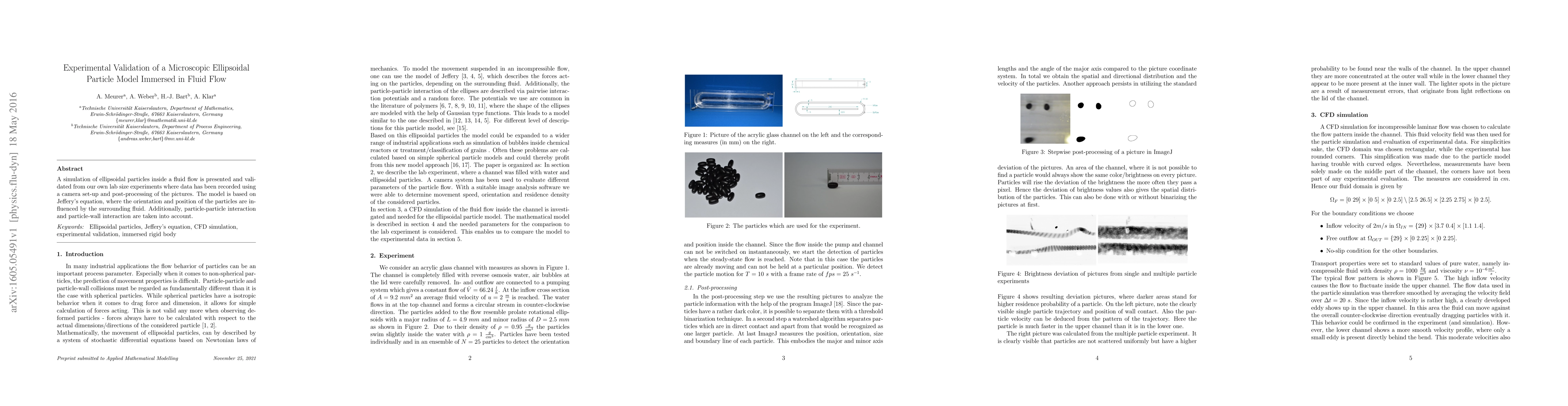 A simulation of ellipsoidal particles inside a fluid flow is presented and validated from our own lab size experiments where data has been recorded using a camera set-up and post-processing of the pictures. The model is based on Jeffery's equation, where the orientation and position of the particles are influenced by the surrounding fluid. Additionally, particle-particle interaction and particle-wall interaction are taken into account.