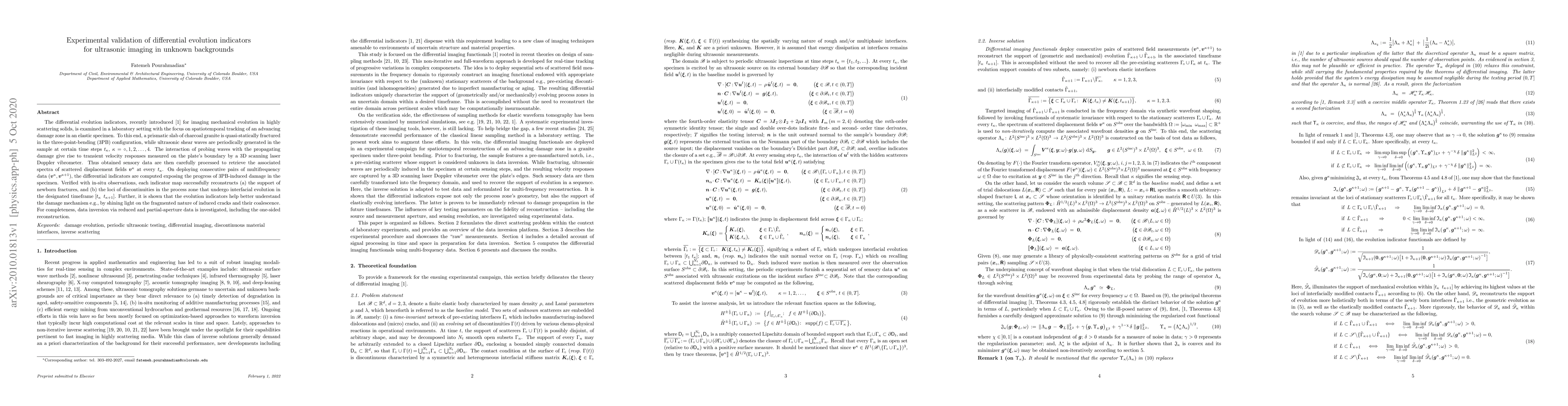 The differential evolution indicators, recently introduced for imaging mechanical evolution in highly scattering solids, is examined in a laboratory setting with the focus on spatiotemporal tracking of an advancing damage zone in an elastic specimen. To this end, a prismatic slab of charcoal granite is quasi-statically fractured in the three-point-bending (3PB) configuration, while ultrasonic shear waves are periodically generated in the sample at certain time steps $t_\kappa$, $\kappa = \circ, 1, 2, ..., 4$. The interaction of probing waves with the propagating damage give rise to transient velocity responses measured on the plate's boundary by a 3D scanning laser Doppler vibrometer. Thus obtained sensory data are then carefully processed to retrieve the associated spectra of scattered displacement fields $v^\kappa$ at every $t_\kappa$. On deploying consecutive pairs of multi-frequency data $(v^\kappa, v^{\kappa+1})$, the differential indicators are computed exposing the progress of 3PB-induced damage in the specimen. Verified with in-situ observations, each indicator map successfully reconstructs (a) the support of newborn fractures, and (b) the loci of discontinuities in the process zone that undergo interfacial evolution in the designated timeframe $[t_\kappa \,\,\, t_{\kappa+1}]$. Further, it is shown that the evolution indicators help better understand the damage mechanism e.g., by shining light on the fragmented nature of induced cracks and their coalescence. For completeness, data inversion via reduced and partial-aperture data is investigated, including the one-sided reconstruction.