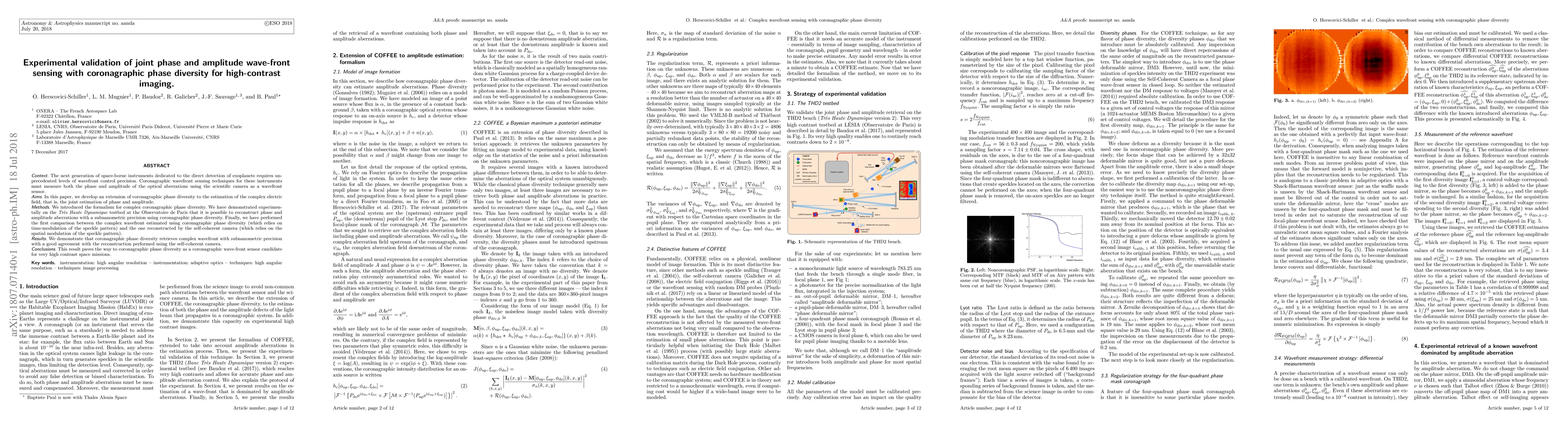 Context. The next generation of space-borne instruments dedicated to the direct detection of exoplanets requires unprecedented levels of wavefront control precision. Coronagraphic wavefront sensing techniques for these instruments must measure both the phase and amplitude of the optical aberrations using the scientific camera as a wavefront sensor. Aims. In this paper, we develop an extension of coronagraphic phase diversity to the estimation of the complex electric field, that is, the joint estimation of phase and amplitude. Methods. We introduced the formalism for complex coronagraphic phase diversity. We have demonstrated experimentally on the Tr\`es Haute Dynamique testbed at the Observatoire de Paris that it is possible to reconstruct phase and amplitude aberrations with a subnanometric precision using coronagraphic phase diversity. Finally, we have performed the first comparison between the complex wavefront estimated using coronagraphic phase diversity (which relies on time-modulation of the speckle pattern) and the one reconstructed by the self-coherent camera (which relies on the spatial modulation of the speckle pattern). Results. We demonstrate that coronagraphic phase diversity retrieves complex wavefront with subnanometric precision with a good agreement with the reconstruction performed using the self-coherent camera. Conclusions. This result paves the way to coronagraphic phase diversity as a coronagraphic wave-front sensor candidate for very high contrast space missions.