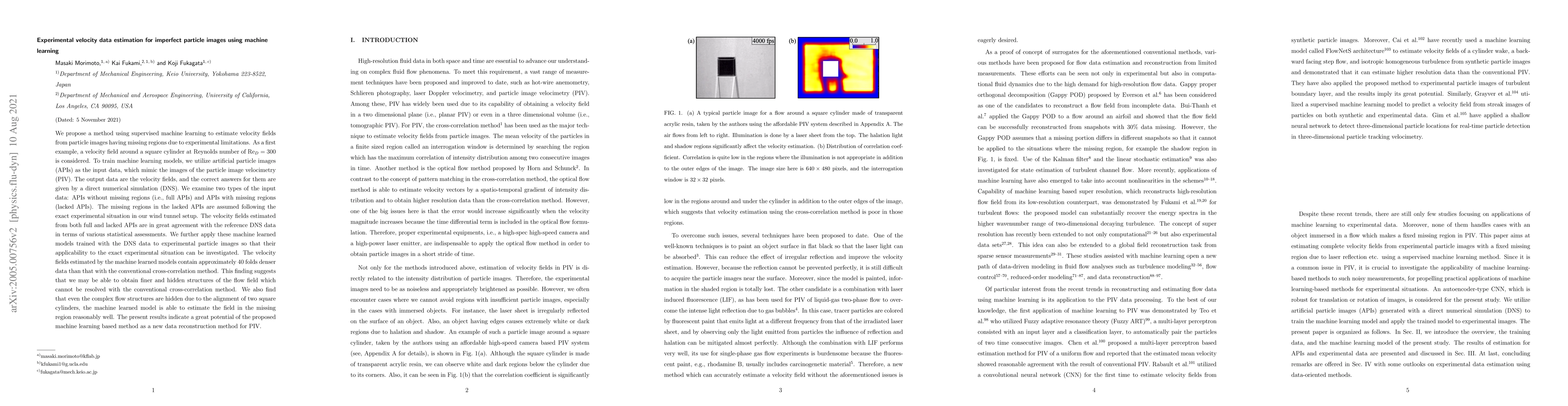 This paper proposes a supervised machine learning method to estimate velocity fields from particle images with missing data due to experimental limitations. The method is tested on a square cylinder flow at Re_D=300, showing that it can reconstruct velocity fields with high accuracy and density compared to conventional methods, indicating potential for revealing finer flow structures.