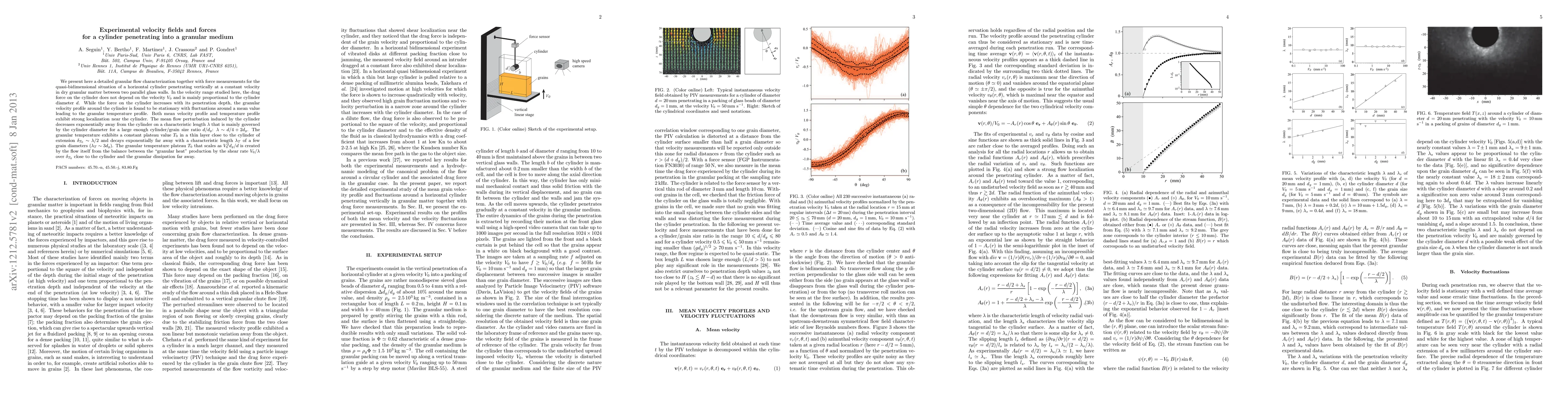 We present here a detailed granular flow characterization together with force measurements for the quasi-bidimensional situation of a horizontal cylinder penetrating vertically at a constant velocity in dry granular matter between two parallel glass walls. In the velocity range studied here, the drag force on the cylinder does not depend on the velocity V_0 and is mainly proportional to the cylinder diameter d. Whereas the force on the cylinder increases with its penetration depth, the granular velocity profile around the cylinder is found stationary with fluctuations around a mean value leading to the granular temperature profile. Both mean velocity profile and temperature profile exhibit strong localization near the cylinder. The mean flow perturbation induced by the cylinder decreases exponentially away from the cylinder on a characteristic length \lambda, that is mainly governed by the cylinder diameter for large enough cylinder/grain size ratio d/d_g: \lambda ~ d/4 + 2d_g. The granular temperature exhibits a constant plateau value T_0 in a thin layer close to the cylinder of extension \delta_{T_0} ~ \lambda/2 and decays exponentially far away with a characteristic length \lambda_T of a few grain diameters (\lambda_T ~ 3d_g). The granular temperature plateau T_0 that scales as (V_0^2 d_g/d) is created by the flow itself from the balance between the "granular heat" production by the shear rate V_0/\lambda over \delta_{T_0} close to the cylinder and the granular dissipation far away.