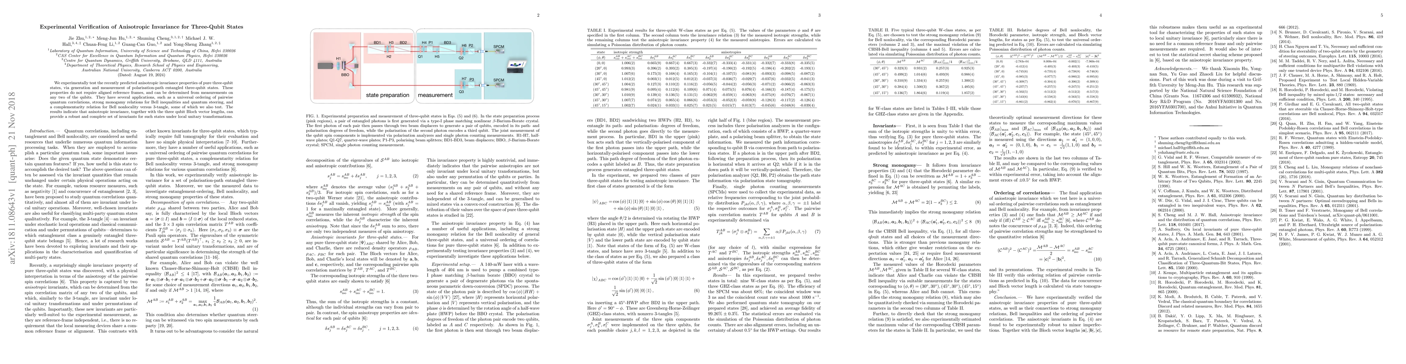 This paper experimentally verifies the anisotropic invariance properties of pure three-qubit states, demonstrating that these properties are robust under local unitary transformations and can be determined from measurements on any two qubits. The findings support the application of these invariants in quantum correlations, Bell inequalities, and quantum steering.