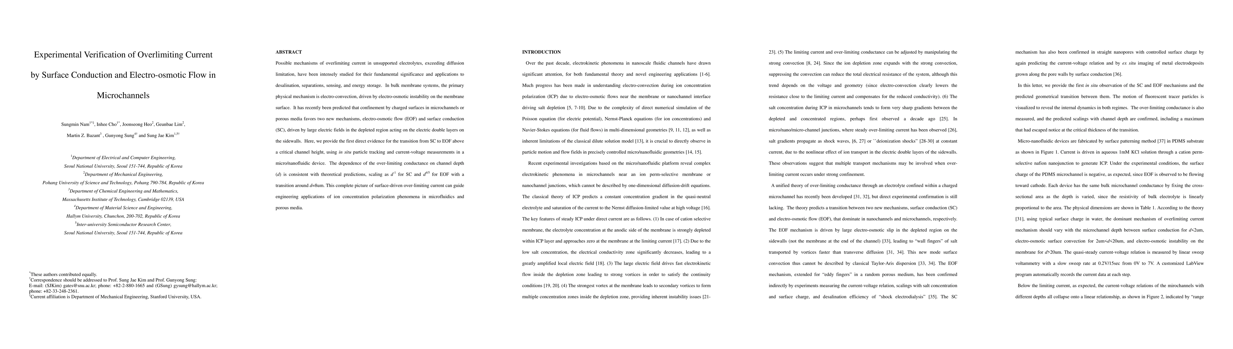 This paper experimentally verifies the transition from surface conduction to electro-osmotic flow in microchannels, providing a detailed analysis of overlimiting current mechanisms. The study confirms theoretical predictions of conductance scaling with channel depth, offering insights into ion concentration polarization in microfluidics.