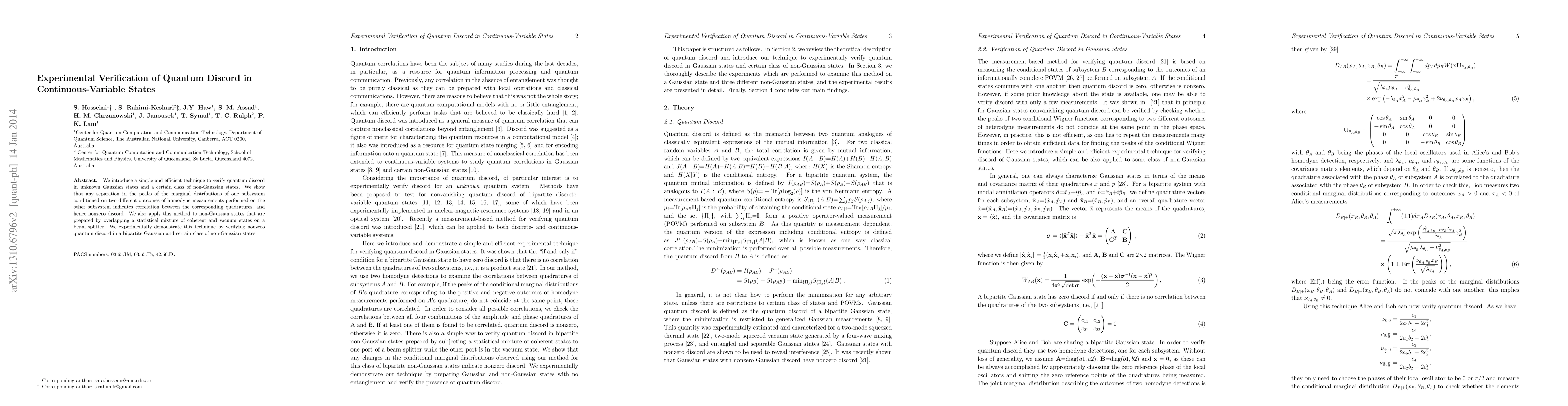 This paper presents a method for verifying quantum discord in continuous-variable Gaussian and non-Gaussian states, showing that peak separation in marginal distributions from homodyne measurements indicates nonzero discord. Experimental results confirm the presence of quantum discord in tested states.