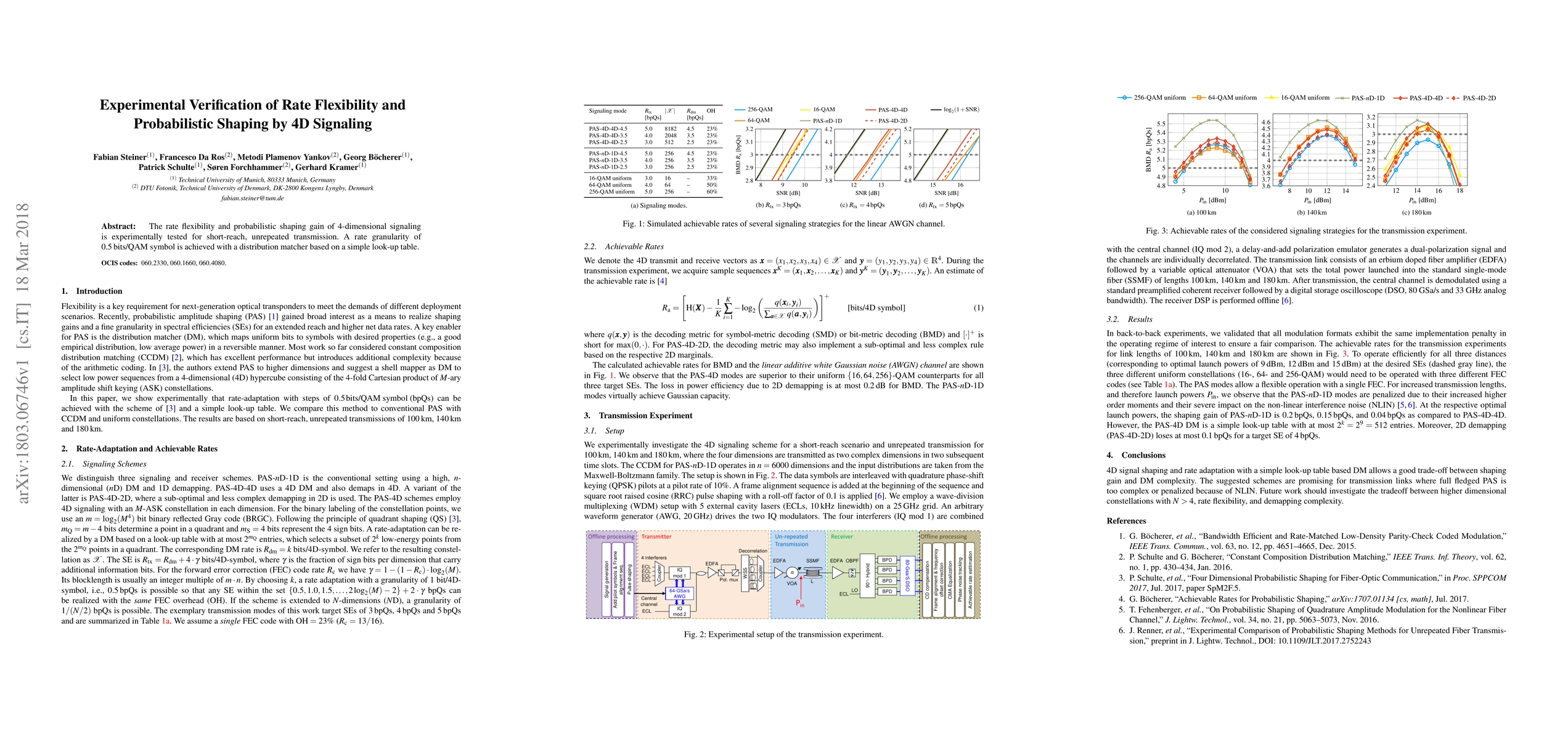 Summary: This paper experimentally verifies the rate flexibility and probabilistic shaping benefits of 4D signaling in short-reach, unrepeated transmission, demonstrating a rate granularity of 0.5 bits/QAM symbol using a distribution matcher with a look-up table.