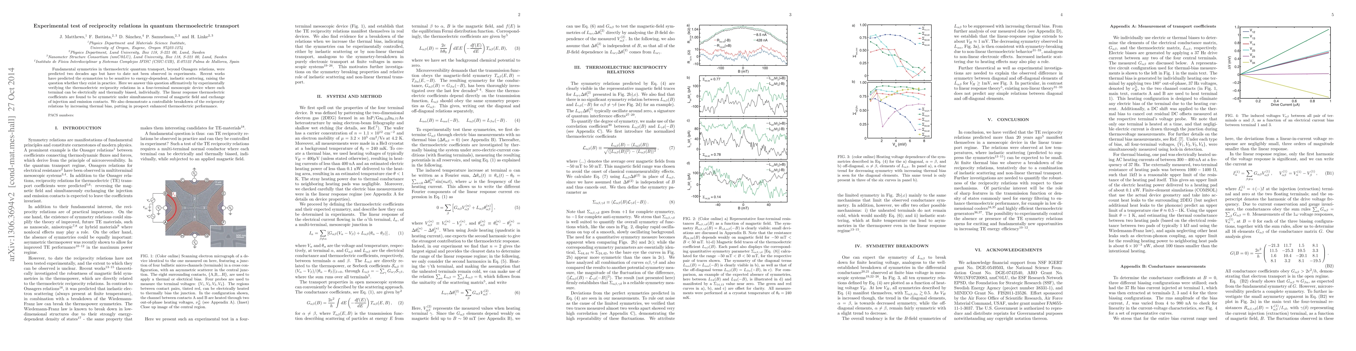 This research experimentally confirms the predicted reciprocity relations in quantum thermoelectric transport using a four-terminal mesoscopic device. The study finds these relations to be valid but notes their breakdown under increased thermal bias, indicating potential for improving thermoelectric efficiency.