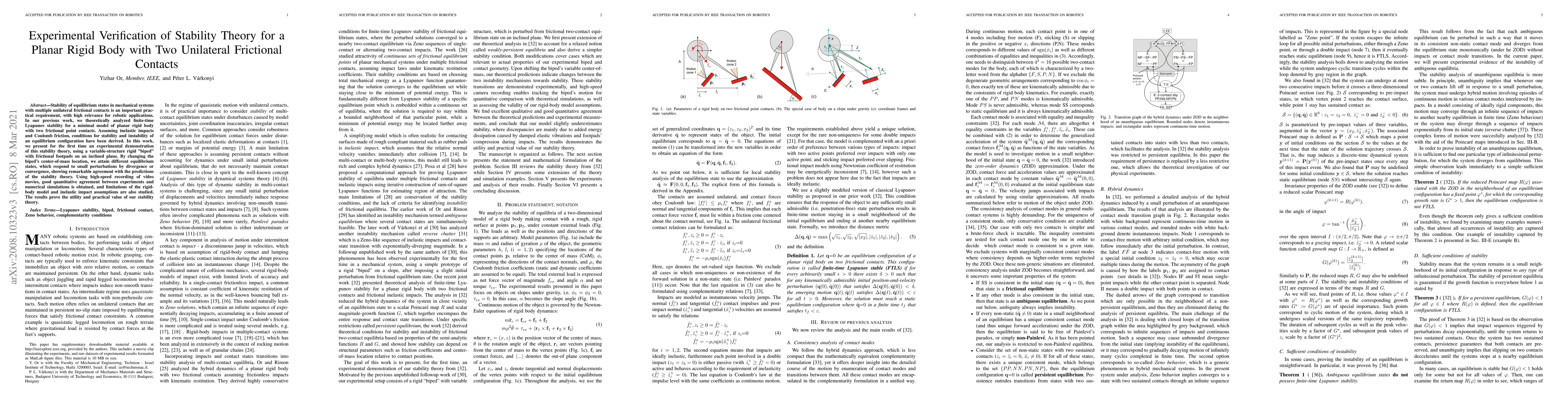 This paper experimentally verifies the stability theory for a planar rigid body with two unilateral frictional contacts, demonstrating stability and instability conditions through a variable-structure biped model. The results show strong agreement with theoretical predictions and highlight the practical value of the stability theory.