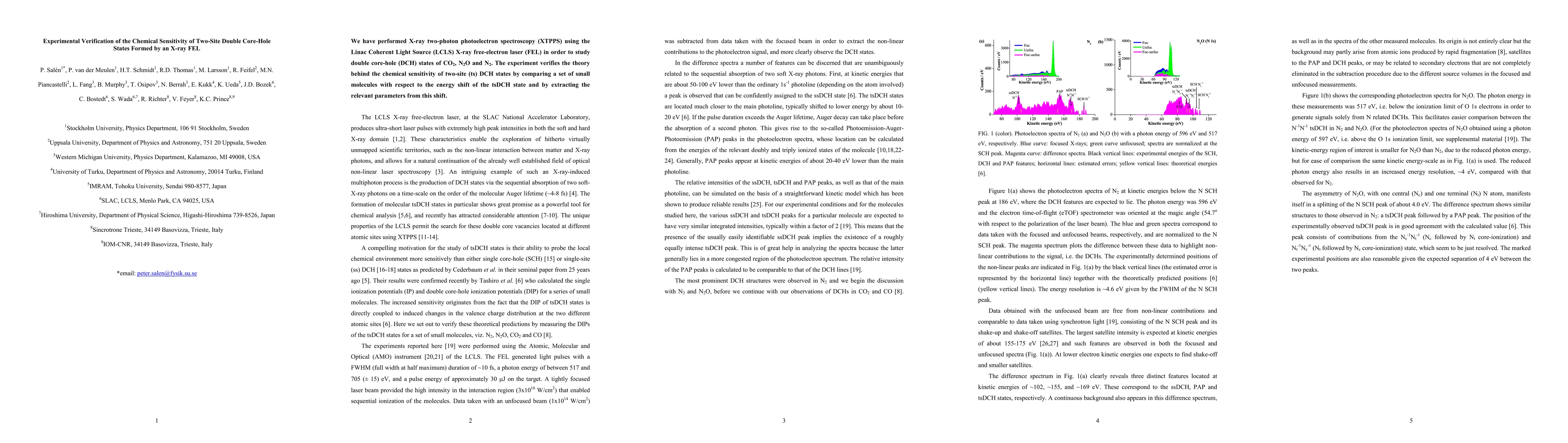 This study uses X-ray two-photon photoelectron spectroscopy from the LCLS X-ray FEL to investigate the chemical sensitivity of double core-hole states in CO2, N2O, and N2. The experiment confirms theoretical predictions regarding the energy shift of two-site double core-hole states, providing insights into the chemical sensitivity of these molecular systems.