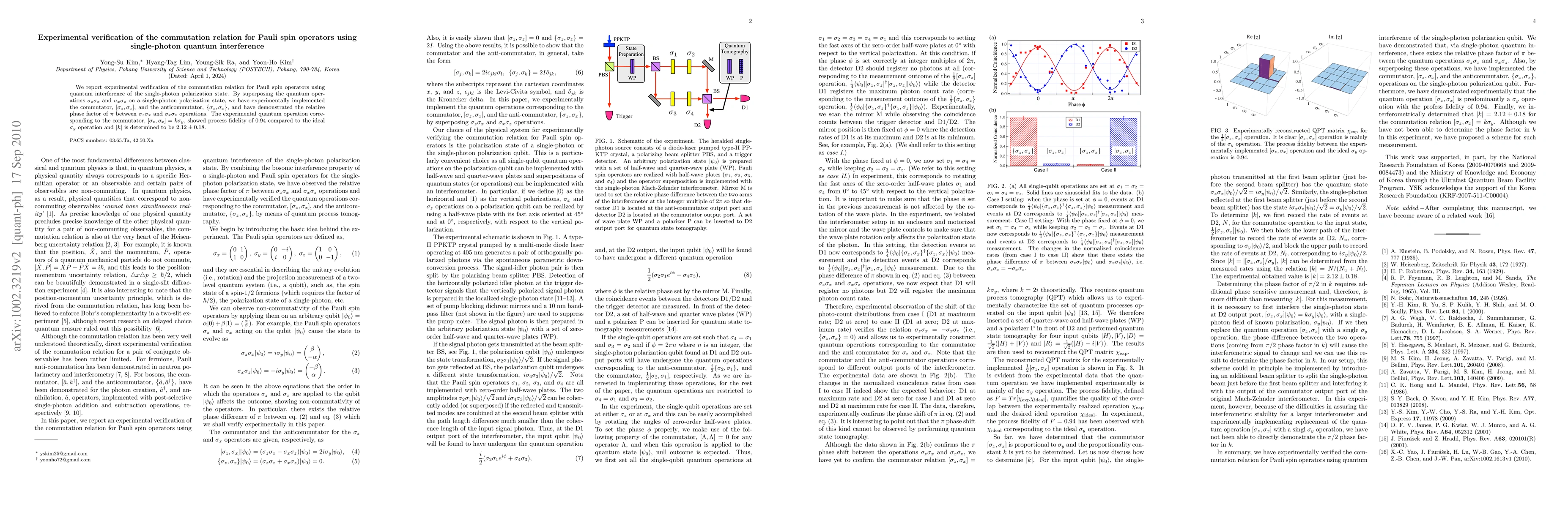 This paper experimentally verifies the commutation relation for Pauli spin operators using single-photon quantum interference, demonstrating the relative phase factor of $\pi$ between $\sigma_z \sigma_x$ and $\sigma_x \sigma_z$ operations, with a process fidelity of 0.94 for the commutator $[\sigma_{z}, \sigma_{x}]=k\sigma_y$.