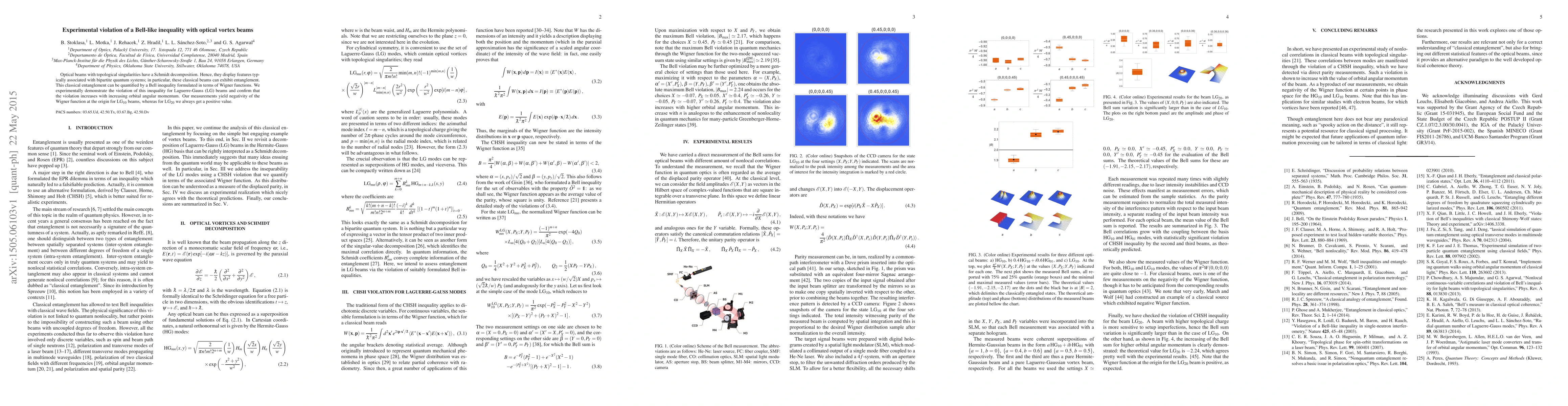 Optical beams with topological singularities have a Schmidt decomposition. Hence, they display features typically associated with bipartite quantum systems; in particular, these classical beams can exhibit entanglement. This classical entanglement can be quantified by a Bell inequality formulated in terms of Wigner functions. We experimentally demonstrate the violation of this inequality for Laguerre-Gauss (LG) beams and confirm that the violation increases with increasing orbital angular momentum. Our measurements yield negativity of the Wigner function at the origin for $\LG_{10}$ beams, whereas for $\LG_{20}$ we always get a positive value.