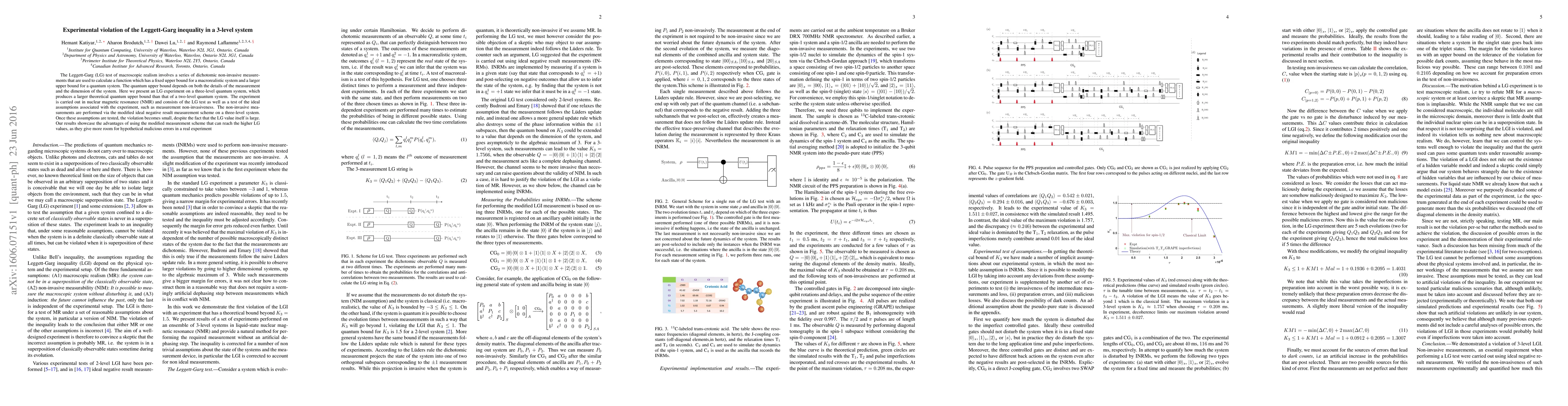 Researchers successfully experimentally violated the Leggett-Garg inequality in a 3-level quantum system, achieving a larger upper bound than expected for a two-level system.