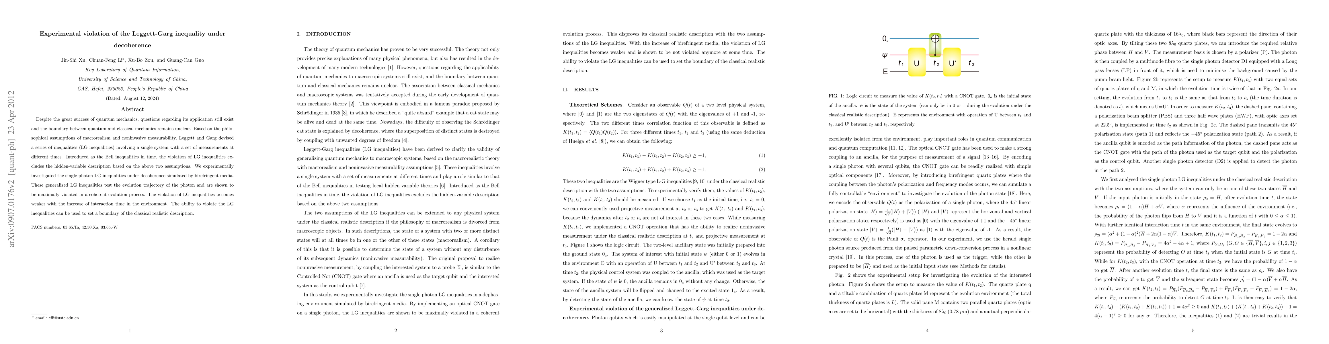 Despite the great success of quantum mechanics, questions regarding its application still exist and the boundary between quantum and classical mechanics remains unclear. Based on the philosophical assumptions of macrorealism and noninvasive measurability, Leggett and Garg devised a series of inequalities (LG inequalities) involving a single system with a set of measurements at different times. Introduced as the Bell inequalities in time, the violation of LG inequalities excludes the hidden-variable description based on the above two assumptions. We experimentally investigated the single photon LG inequalities under decoherence simulated by birefringent media. These generalized LG inequalities test the evolution trajectory of the photon and are shown to be maximally violated in a coherent evolution process. The violation of LG inequalities becomes weaker with the increase of interaction time in the environment. The ability to violate the LG inequalities can be used to set a boundary of the classical realistic description.