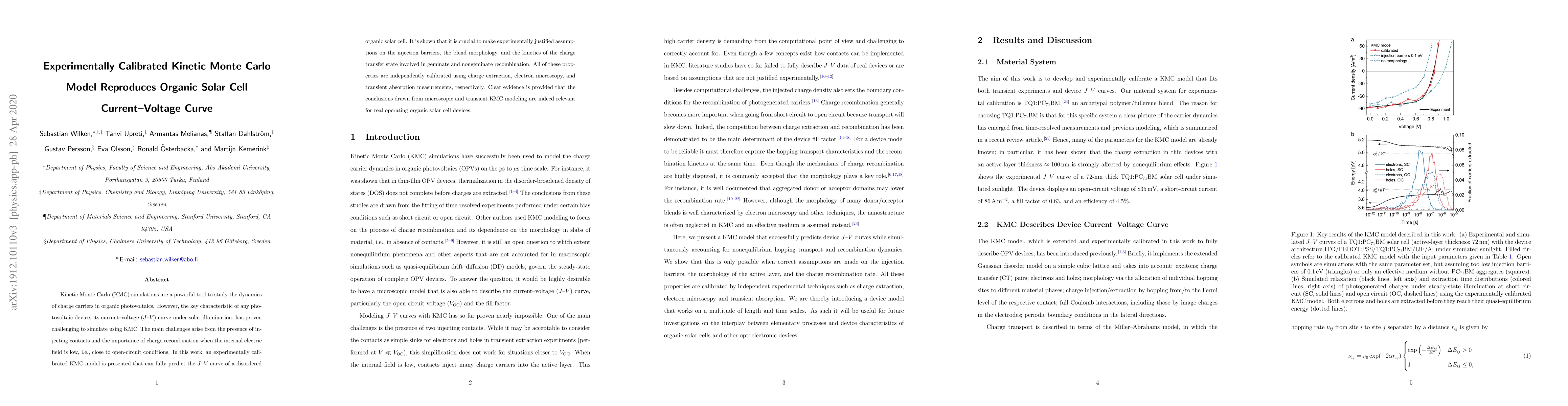 This paper presents an experimentally calibrated Kinetic Monte Carlo model that successfully reproduces the current-voltage curve of an organic solar cell, emphasizing the importance of accurately modeling injection barriers, blend morphology, and recombination kinetics. The model's predictions are validated through various experimental techniques, demonstrating its relevance for real-world devices.
