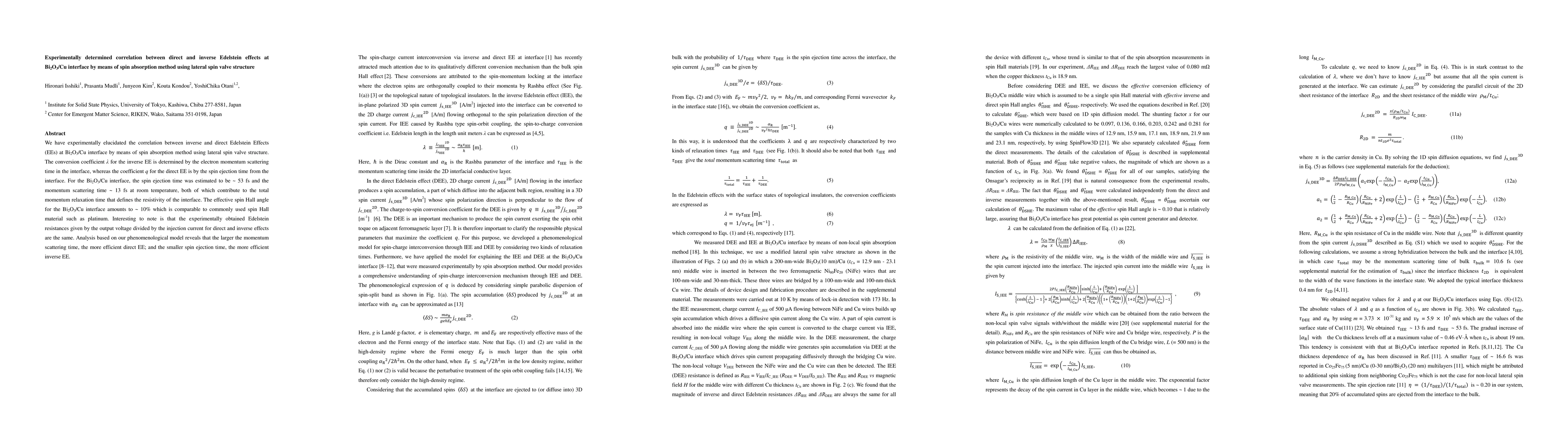 This study experimentally investigates the correlation between direct and inverse Edelstein Effects at Bi2O3/Cu interface using a spin absorption method in lateral spin valve structures. The research finds that the efficiencies of these effects are determined by different time scales: momentum scattering and spin ejection times, respectively.