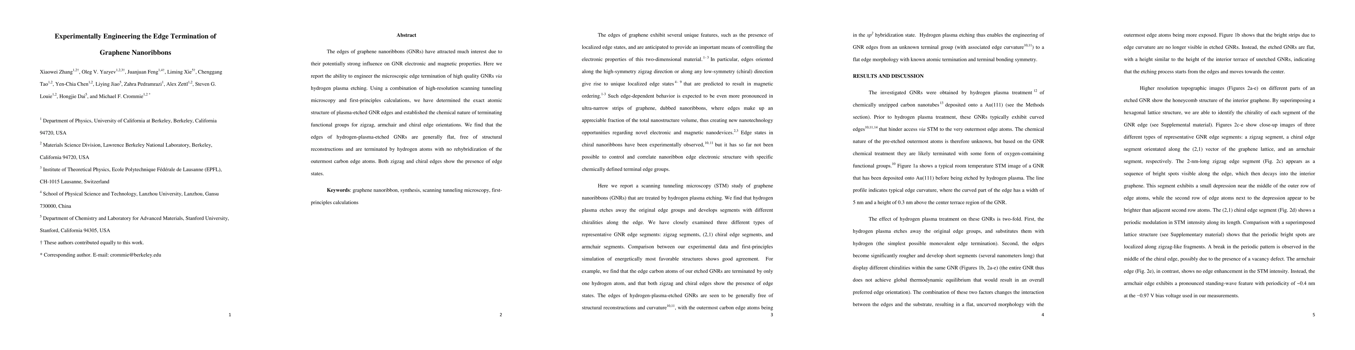 This study demonstrates the successful engineering of graphene nanoribbon (GNR) edge termination using hydrogen plasma etching, revealing flat edges terminated by hydrogen atoms without structural reconstructions, as confirmed by high-resolution microscopy and computational modeling. Edge states are observed in both zigzag and chiral configurations.