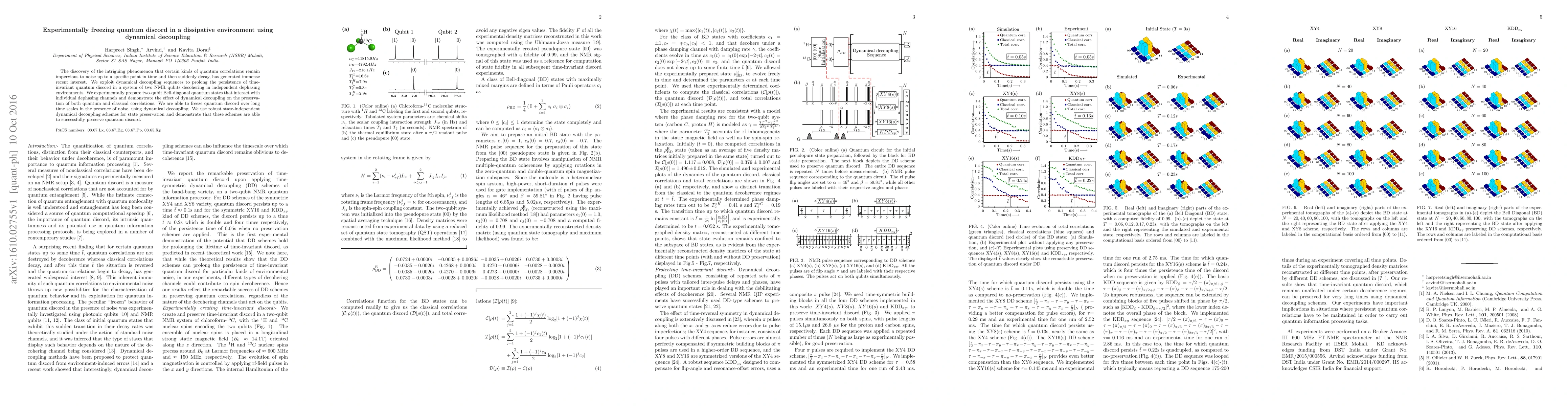 This paper explores the freezing of quantum discord in two NMR qubits subjected to independent dephasing environments using dynamical decoupling techniques. The authors demonstrate that these methods can preserve quantum discord over extended periods despite noise, highlighting the effectiveness of state-independent decoupling schemes in maintaining quantum correlations.