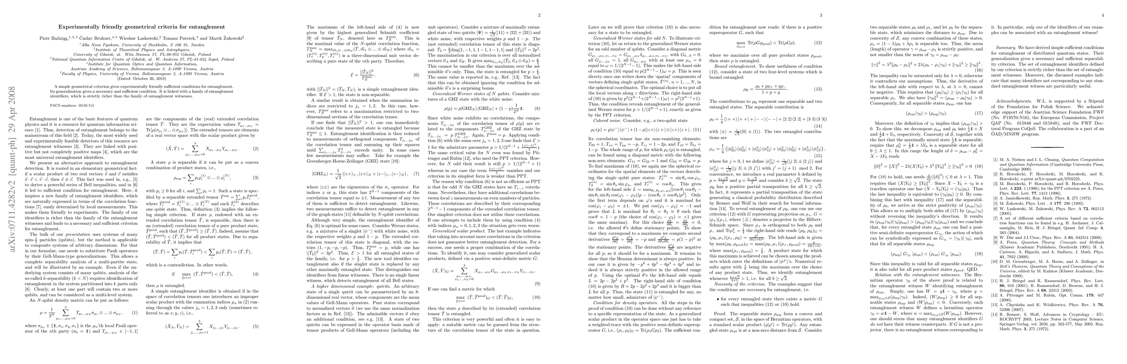 This paper introduces a geometrical entanglement criterion that provides simple, experimentally accessible conditions for detecting entanglement, illustrated with examples. It also generalizes to a necessary and sufficient separability condition, offering a richer set of entanglement identifiers than traditional witnesses.