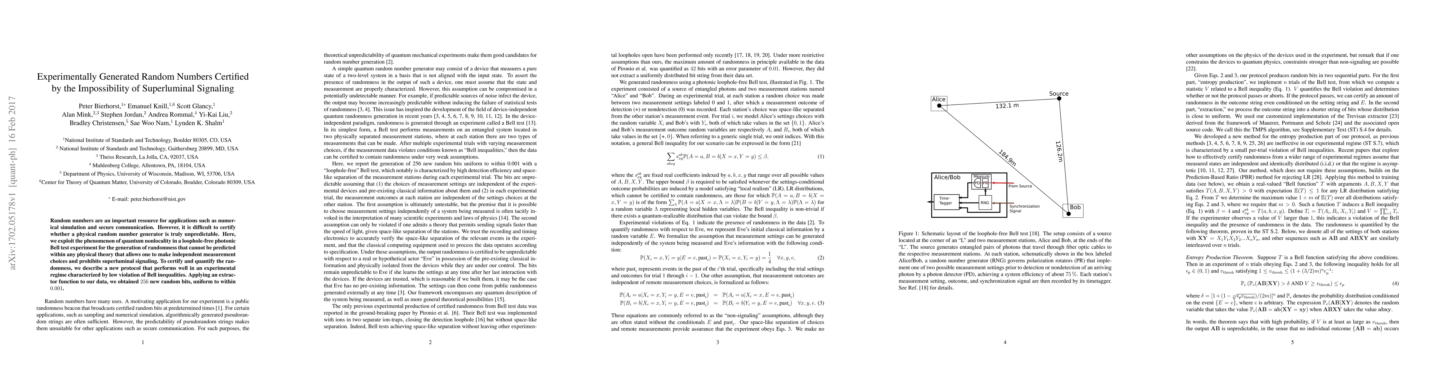 This paper generates random numbers certified by quantum nonlocality in a loophole-free Bell test, ensuring their unpredictability and prohibiting superluminal signaling. The new protocol extracts 256 random bits, uniform to within 0.001, demonstrating the feasibility of certified randomness.