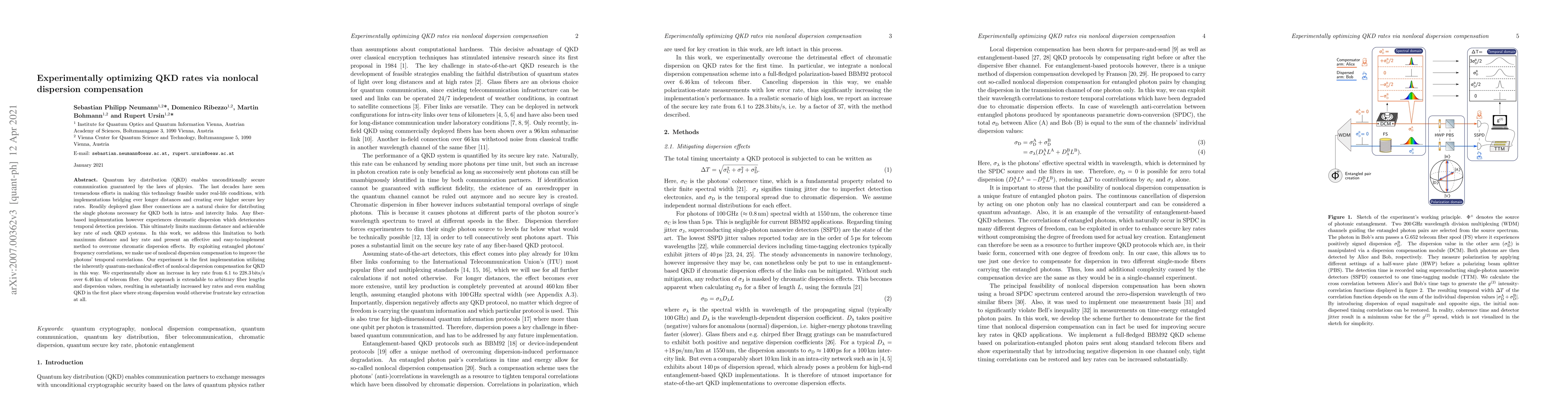 This paper presents an innovative method for optimizing quantum key distribution (QKD) rates by employing nonlocal dispersion compensation to counteract chromatic dispersion in fiber-based systems, significantly increasing the achievable key rate from 6.1 to 228.3 bits/s over 6.46 km. The approach leverages the quantum-mechanical effect of entangled photons' frequency correlations to enhance temporal correlations, extending the feasibility of QKD over longer distances.