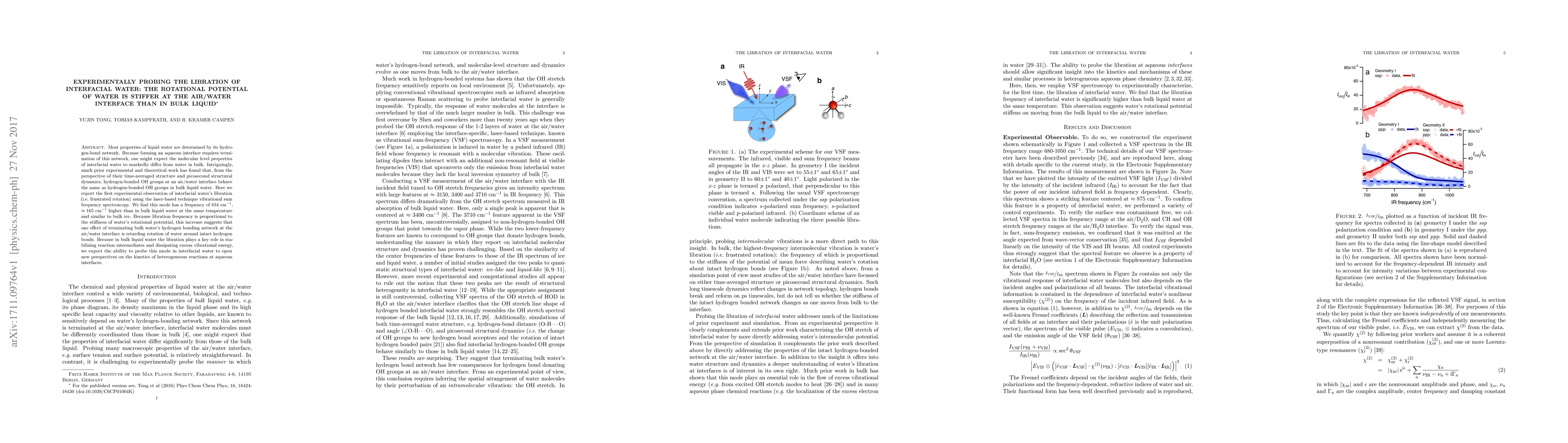 This study experimentally observes the higher frequency of interfacial water's libration using vibrational sum frequency spectroscopy, revealing a stiffer rotational potential at the air/water interface compared to bulk liquid water. This finding suggests that terminating hydrogen bonds at the interface alters the rotational dynamics of water molecules.
