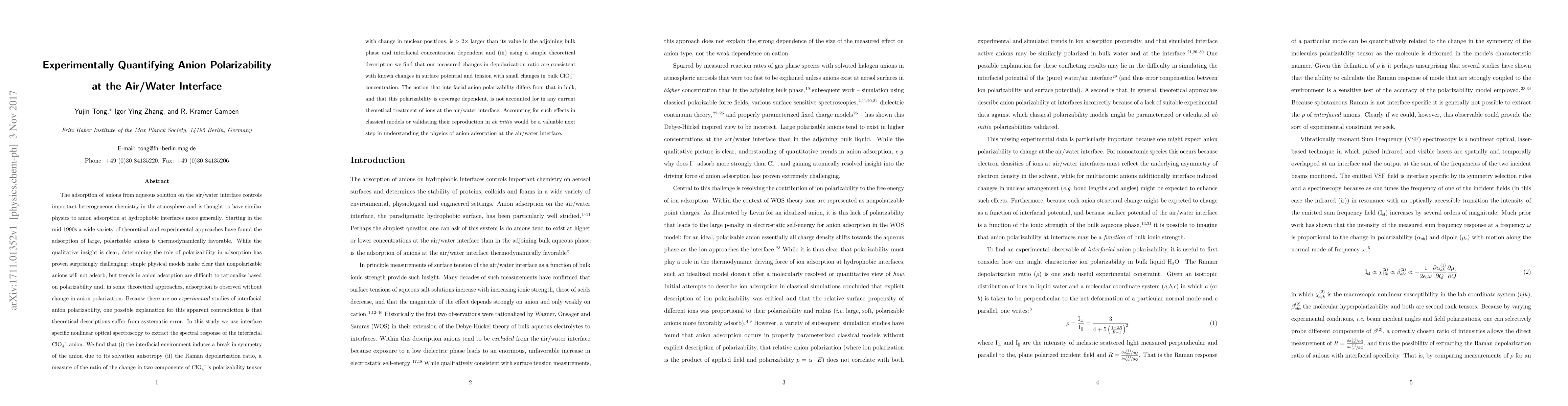 The adsorption of anions from aqueous solution on the air/water interface controls important heterogeneous chemistry in the atmosphere and is thought to have similar physics to anion adsorption at hydrophobic interfaces more generally. While much theoretical and experimental work over the last 20 years has made clear that the adsorption of large, polarizable anions is thermodynamically favorable, determining the role of polarizability in adsorption has proven surprisingly challenging. Simple physical models make clear that nonpolarizable anions will not adsorb, but trends in adsorption are difficult to rationalize based on polarizability and in some theoretical approaches adsorption is observed without change in anion polarization. Because there are no experimental studies of interfacial anion polarizability, one possible explanation of these results is that theoretical descriptions suffer from systematic error. In this study we use interface specific nonlinear optical spectroscopy to extract the spectral response of the interfacial ClO$_{4}^{-}$ anion. We find that (i) the interfacial environment induces a break in symmetry of the anion due to its solvation anisotropy (ii) the Raman depolarization ratio, a measure of the ratio of the change in two components of ClO$_{4}^{-}$'s polarizability tensor with change in nuclear positions, is $>2\times$ larger than its value in the adjoining bulk phase and interfacial concentration dependent and (iii) using a simple theoretical description we find that our measured changes in depolarization ratio are consistent with known changes in surface potential and tension with small changes in bulk ClO$_{4}^{-}$ concentration. The notion that interfacial anion polarizability differs from that in bulk, and that this polarizability is coverage dependent, is not accounted for in any current theoretical treatment of ions at the air/water interface.