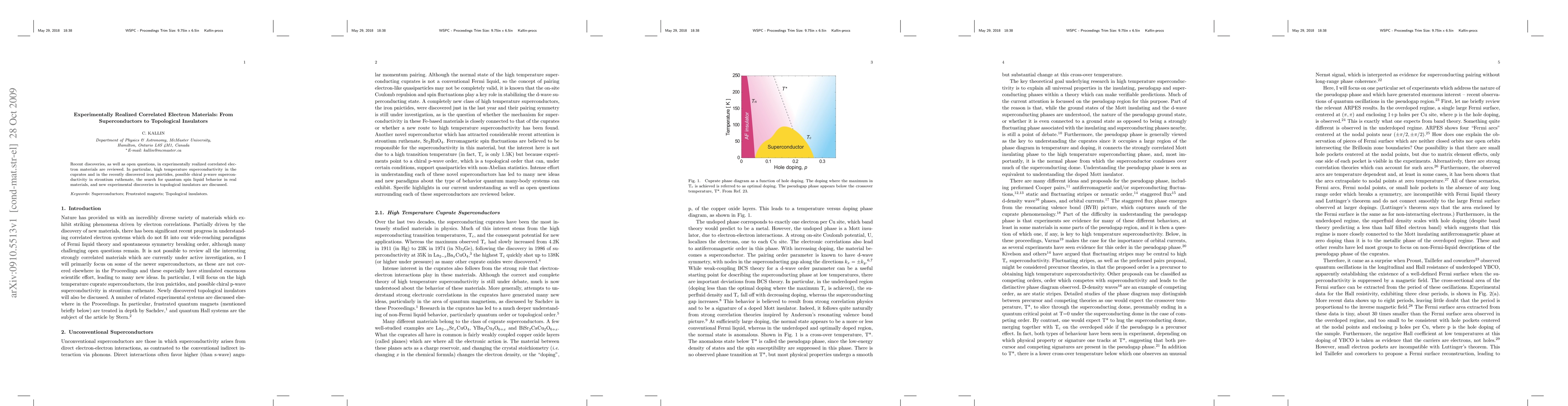 This paper reviews recent advancements in experimentally realized correlated electron materials, focusing on high-temperature superconductivity in cuprates and iron pnictides, chiral p-wave superconductivity in strontium ruthenate, quantum spin liquid behavior, and new findings in topological insulators.