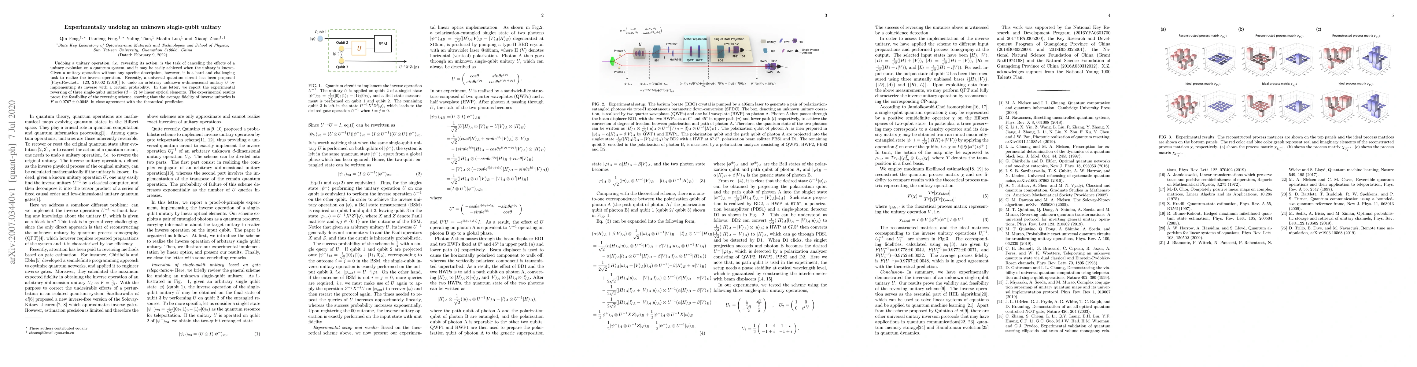 This paper demonstrates experimentally the reversal of unknown single-qubit unitaries using linear optical elements, achieving an average fidelity of $F=0.9767\pm0.0048$, which validates the proposed universal quantum circuit method. The results confirm the feasibility of undoing arbitrary unknown unitary operations.