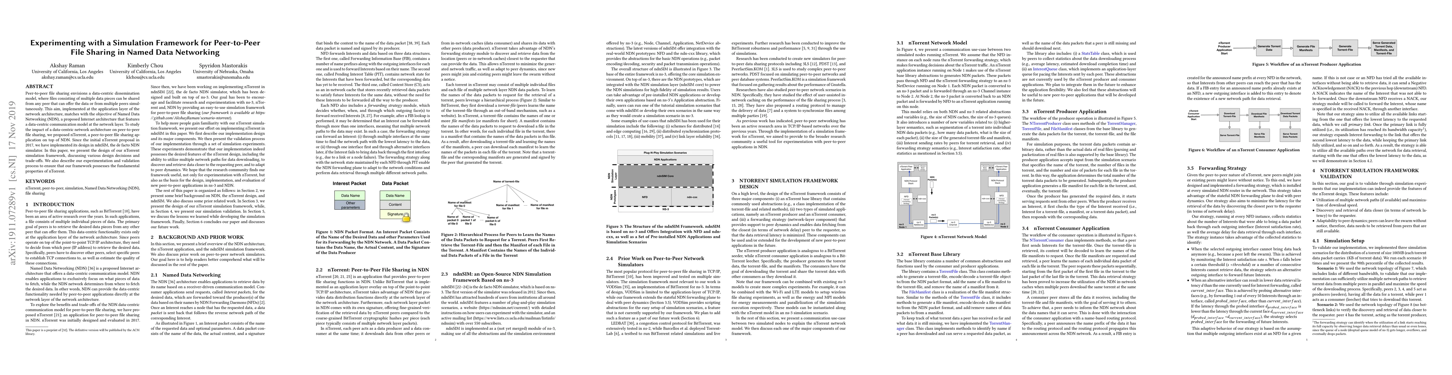 This paper proposes nTorrent, a peer-to-peer file sharing application built on Named Data Networking (NDN), and presents its simulation framework in ndnSIM. The authors discuss the design decisions and trade-offs, and validate the framework to ensure it embodies nTorrent's core functionalities.