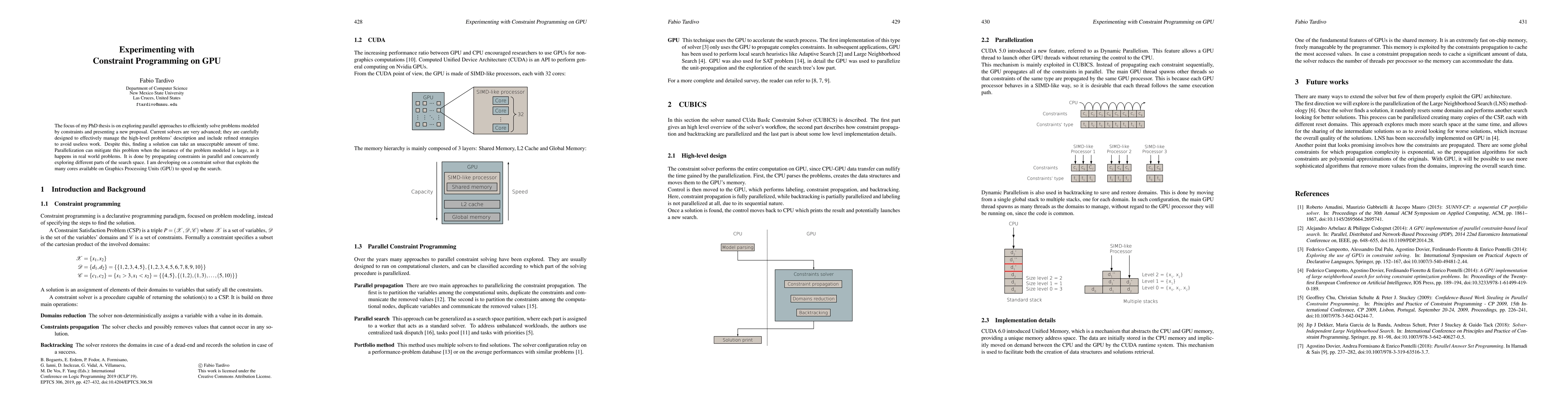 The focus of my PhD thesis is on exploring parallel approaches to efficiently solve problems modeled by constraints and presenting a new proposal. Current solvers are very advanced; they are carefully designed to effectively manage the high-level problems' description and include refined strategies to avoid useless work. Despite this, finding a solution can take an unacceptable amount of time. Parallelization can mitigate this problem when the instance of the problem modeled is large, as it happens in real world problems. It is done by propagating constraints in parallel and concurrently exploring different parts of the search space. I am developing on a constraint solver that exploits the many cores available on Graphics Processing Units (GPU) to speed up the search.
