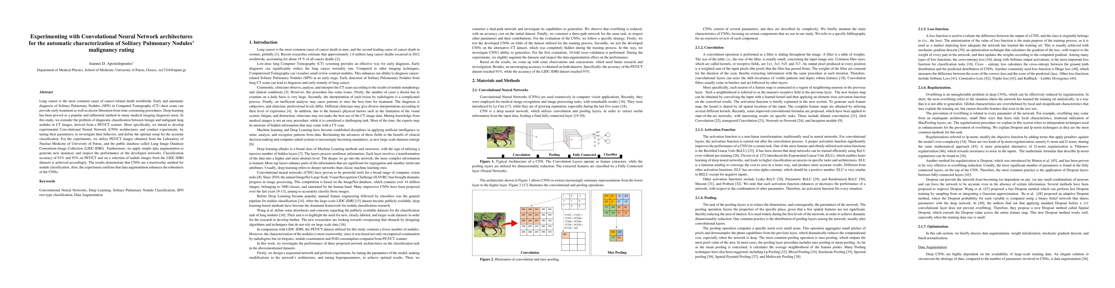 This study explores various Convolutional Neural Network (CNN) architectures for classifying solitary pulmonary nodules as benign or malignant in CT scans, achieving 91% and 93% accuracy on PET/CT and LIDC-IDRI datasets respectively. Data augmentation improves CNN robustness, highlighting the potential of deep learning in early lung cancer diagnosis.