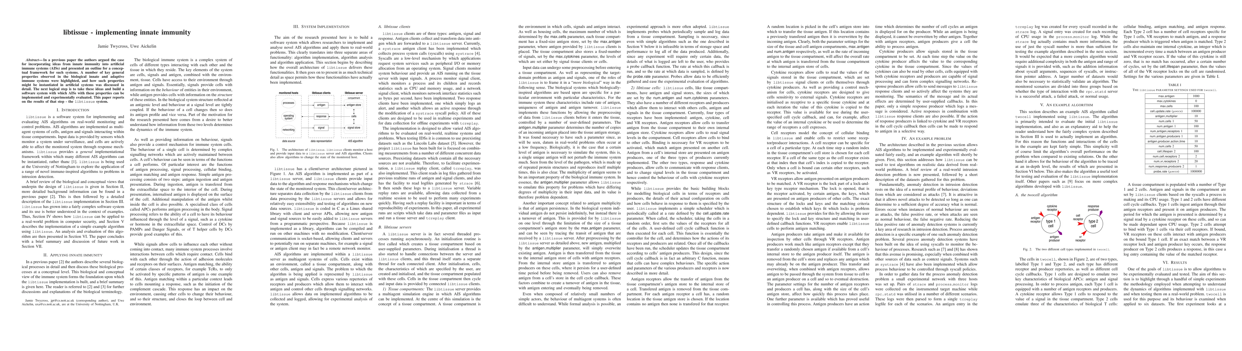 In a previous paper the authors argued the case for incorporating ideas from innate immunity into artificial immune systems (AISs) and presented an outline for a conceptual framework for such systems. A number of key general properties observed in the biological innate and adaptive immune systems were highlighted, and how such properties might be instantiated in artificial systems was discussed in detail. The next logical step is to take these ideas and build a software system with which AISs with these properties can be implemented and experimentally evaluated. This paper reports on the results of that step - the libtissue system.
