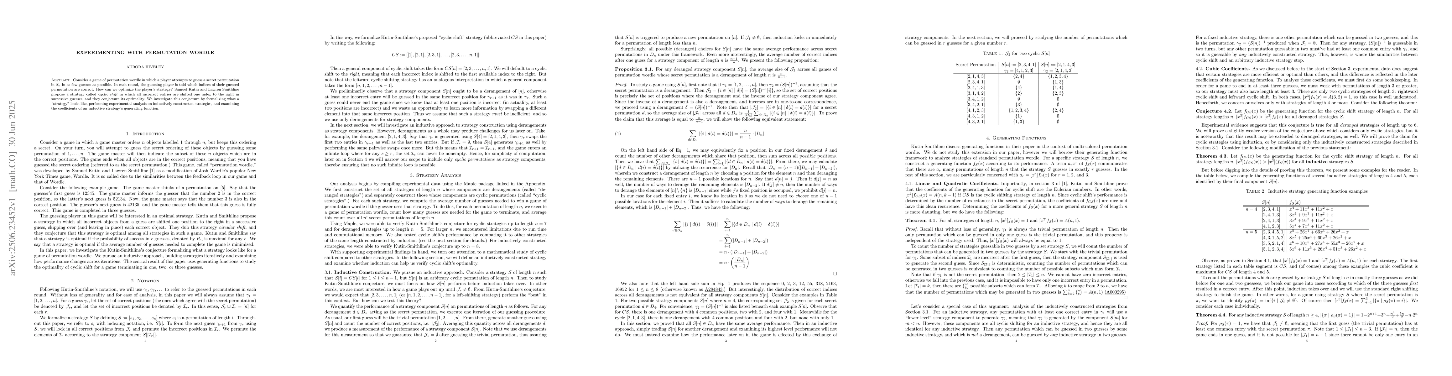 Consider a game of permutation wordle in which a player attempts to guess a secret permutation of length $n$ in as few guesses as possible. In each round, the guessing player is told which indices of their guessed permutation are correct. How can we optimize the player's strategy? Samuel Kutin and Lawren Smithline (arXiv:2408.00903) propose a strategy called "cyclic shift" in which all incorrect entries are shifted one index to the right in successive guesses, and they conjecture its optimality. We investigate this conjecture by formalizing what a strategy looks like, performing experimental analysis on inductively constructed strategies, and examining the coefficients of an inductive strategy's generating function.