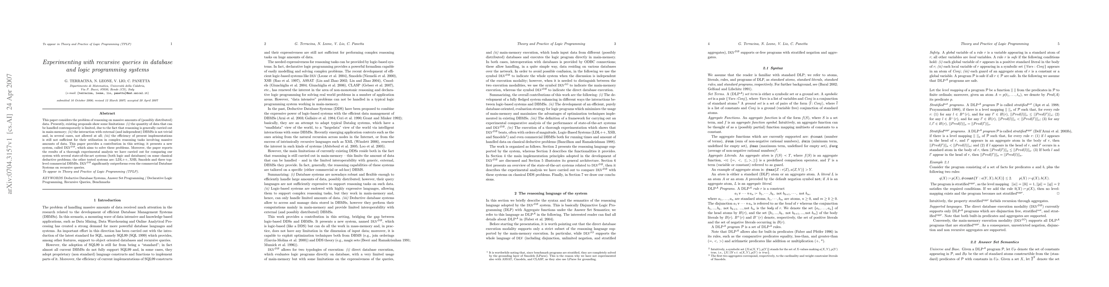 This paper considers the problem of reasoning on massive amounts of (possibly distributed) data. Presently, existing proposals show some limitations: {\em (i)} the quantity of data that can be handled contemporarily is limited, due to the fact that reasoning is generally carried out in main-memory; {\em (ii)} the interaction with external (and independent) DBMSs is not trivial and, in several cases, not allowed at all; {\em (iii)} the efficiency of present implementations is still not sufficient for their utilization in complex reasoning tasks involving massive amounts of data. This paper provides a contribution in this setting; it presents a new system, called DLV$^{DB}$, which aims to solve these problems. Moreover, the paper reports the results of a thorough experimental analysis we have carried out for comparing our system with several state-of-the-art systems (both logic and databases) on some classical deductive problems; the other tested systems are: LDL++, XSB, Smodels and three top-level commercial DBMSs. DLV$^{DB}$ significantly outperforms even the commercial Database Systems on recursive queries. To appear in Theory and Practice of Logic Programming (TPLP)