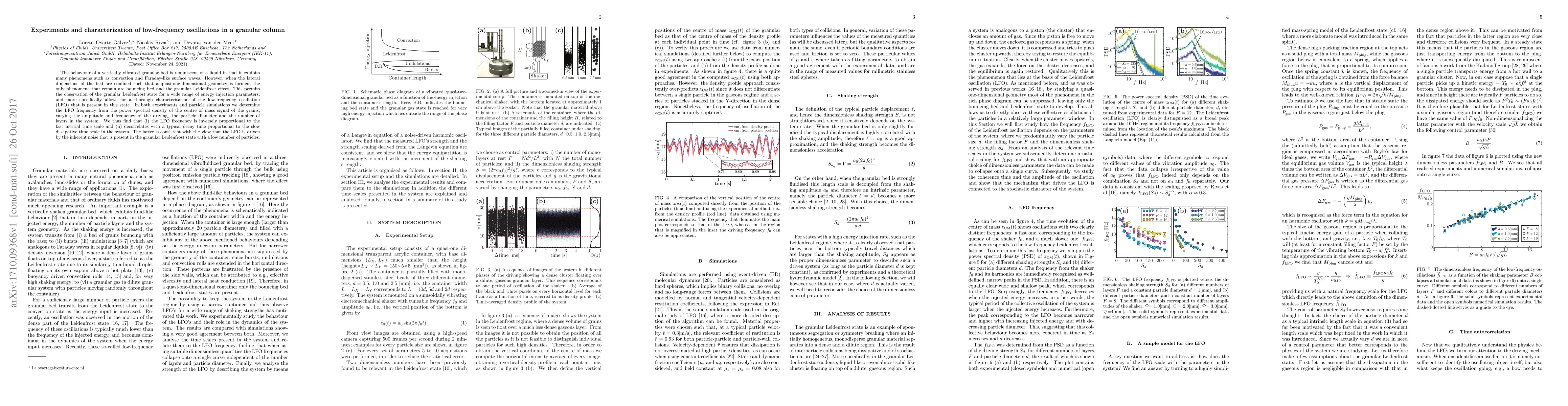 Researchers studied low-frequency oscillations in a granular column and found that their frequency is inversely proportional to the fast inertial time scale and decorrelates with a typical decay time proportional to the slow dissipative time scale.