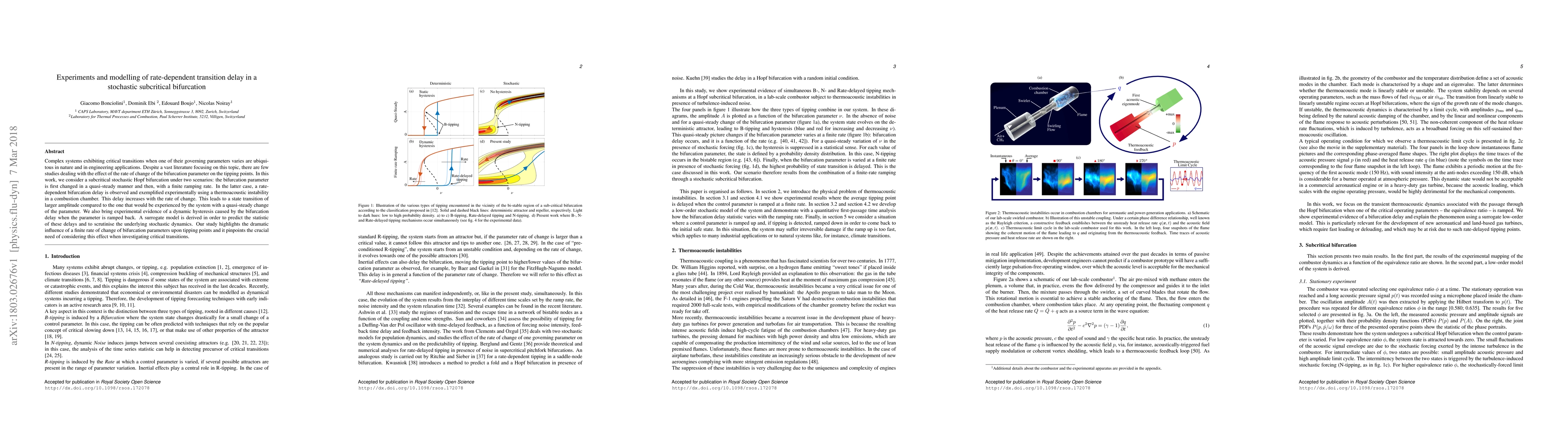 Complex systems exhibiting critical transitions when one of their governing parameters varies are ubiquitous in nature and in engineering applications. Despite a vast literature focusing on this topic, there are few studies dealing with the effect of the rate of change of the bifurcation parameter on the tipping points. In this work, we consider a subcritical stochastic Hopf bifurcation under two scenarios: the bifurcation parameter is first changed in a quasi-steady manner and then, with a finite ramping rate. In the latter case, a rate-dependent bifurcation delay is observed and exemplified experimentally using a thermoacoustic instability in a combustion chamber. This delay increases with the rate of change. This leads to a state transition of larger amplitude compared to the one that would be experienced by the system with a quasi-steady change of the parameter. We also bring experimental evidence of a dynamic hysteresis caused by the bifurcation delay when the parameter is ramped back. A surrogate model is derived in order to predict the statistic of these delays and to scrutinise the underlying stochastic dynamics. Our study highlights the dramatic influence of a finite rate of change of bifurcation parameters upon tipping points and it pinpoints the crucial need of considering this effect when investigating critical transitions.