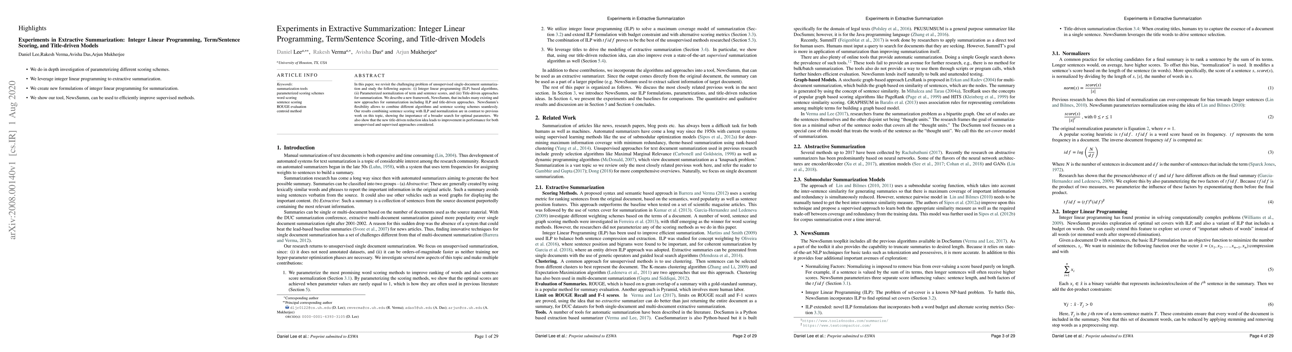 This paper explores unsupervised single-document summarization using Integer Linear Programming, term/sentence scoring, and title-driven models, introducing a flexible framework called NewsSumm. The study finds that combining sentence scoring with ILP and normalization can outperform previous methods, and title-driven approaches enhance both unsupervised and supervised summarization performance.