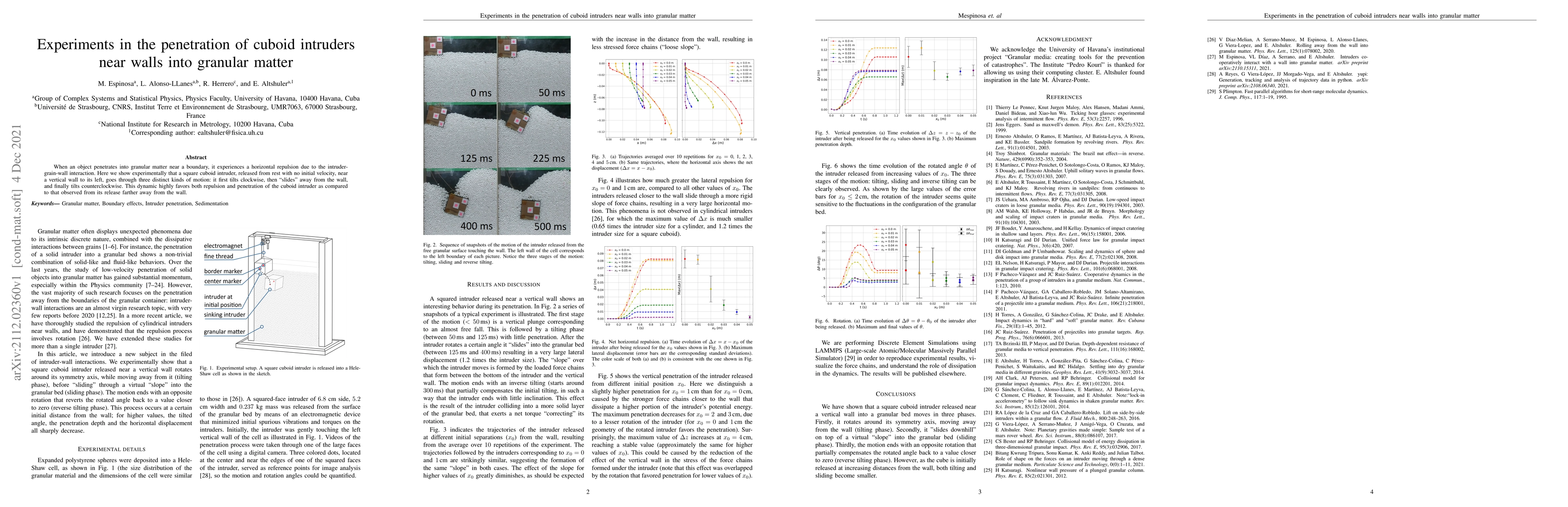 This study experimentally investigates the motion of a square cuboid intruder near a vertical wall as it penetrates granular matter, revealing three distinct phases: initial clockwise tilt, subsequent sliding away from the wall, and final counterclockwise tilt, which enhances repulsion and penetration compared to intrusions farther from the wall.