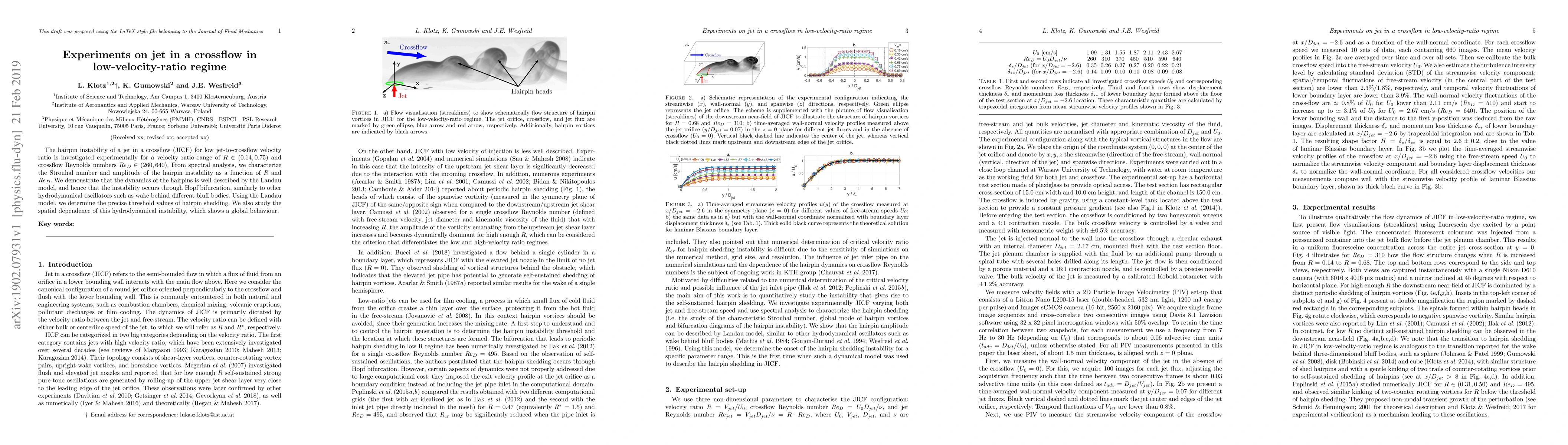 This paper experimentally investigates the hairpin instability of a jet in a crossflow at low velocity ratios, identifying the Strouhal number and amplitude variations. The study confirms the instability's occurrence via Hopf bifurcation, similar to other hydrodynamic oscillators, and determines precise threshold values using the Landau model.
